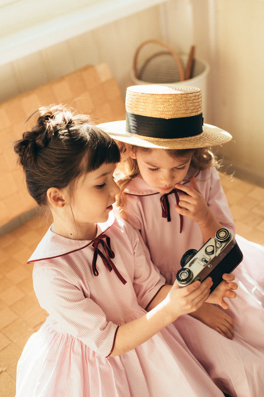 Różowa sukienka w paski, z kołnierzykiem i kokardką