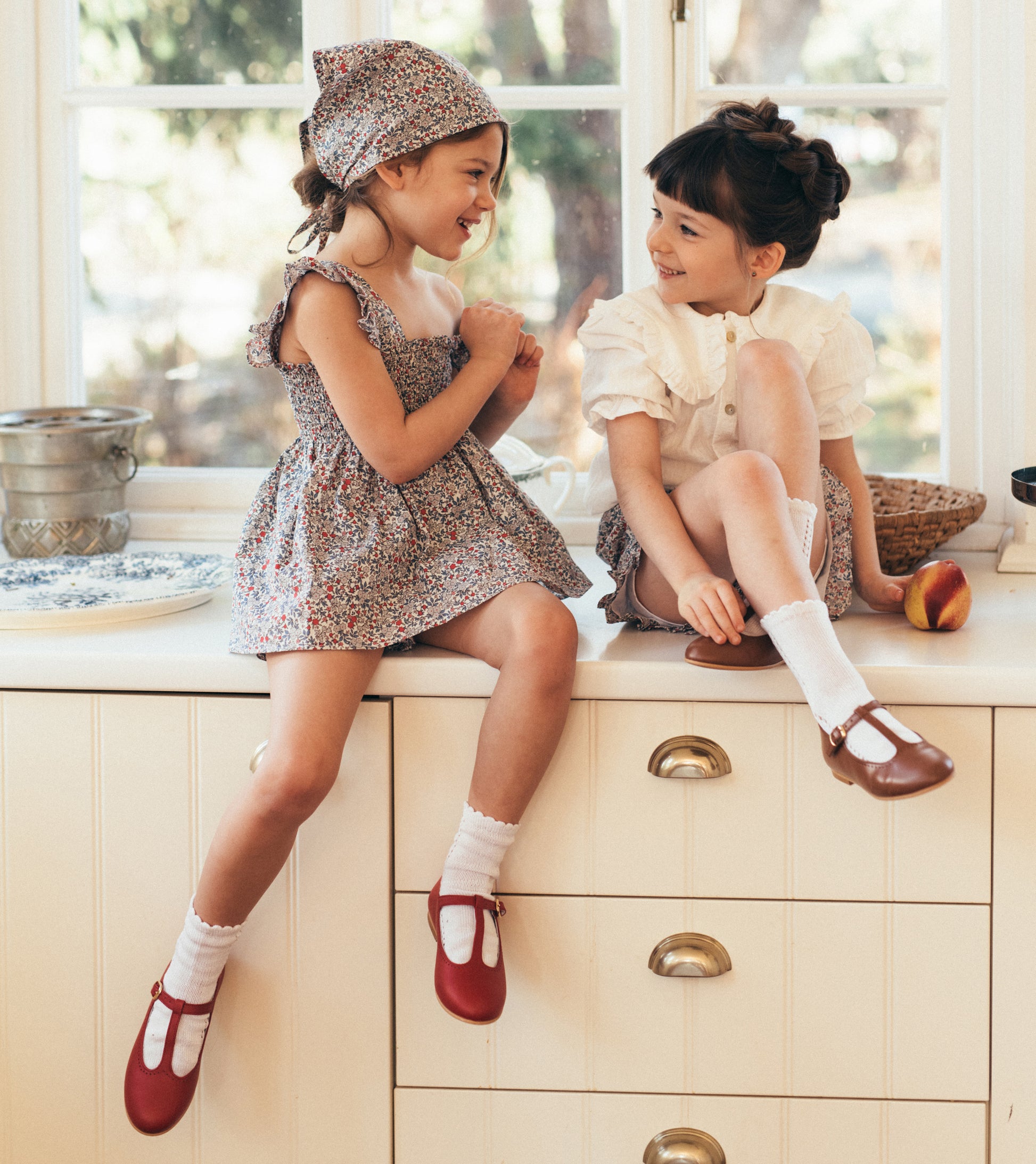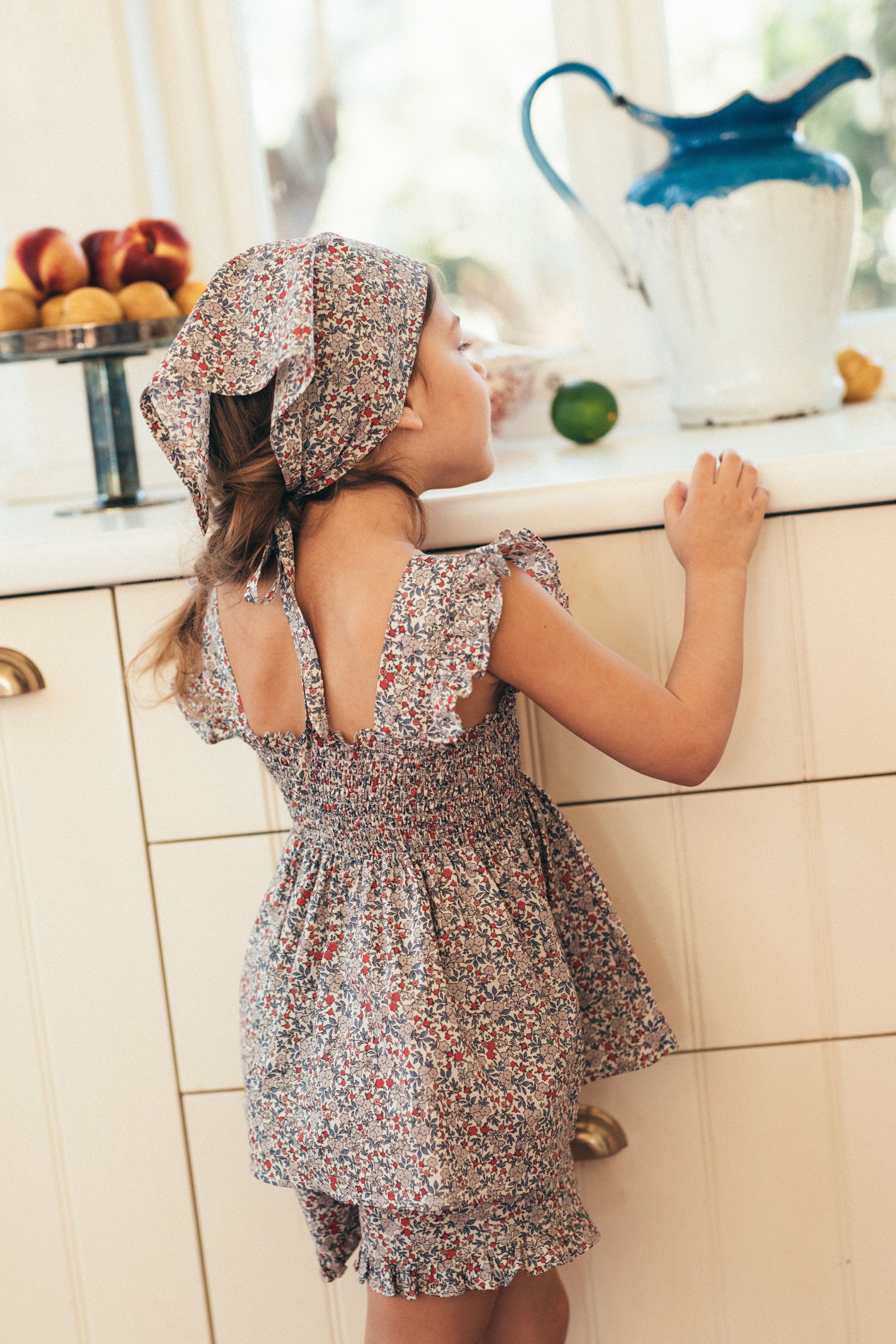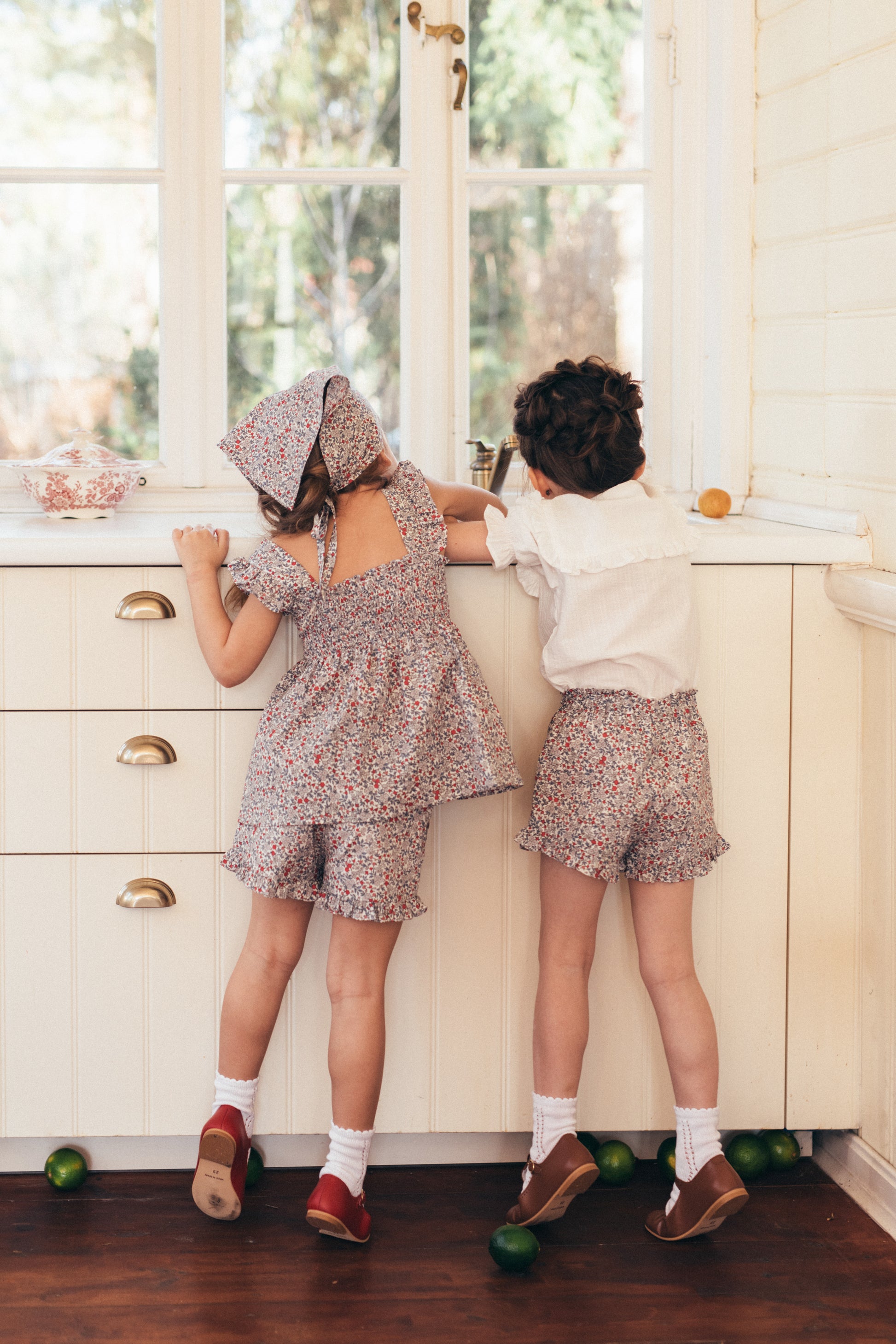 Nasza Sara to idealna bluzka na upalne dni. Pasuje do szortów i spódniczek, a także długich spodni na wieczorne chłody. Ma urocze marszczenie, dzięki czemu jest dobrze dopasowana. Rękawki są ozdobione delikatną falbanką pasującą do naszych szortów Grace. Została wykonana w 100% z organicznej bawełny.