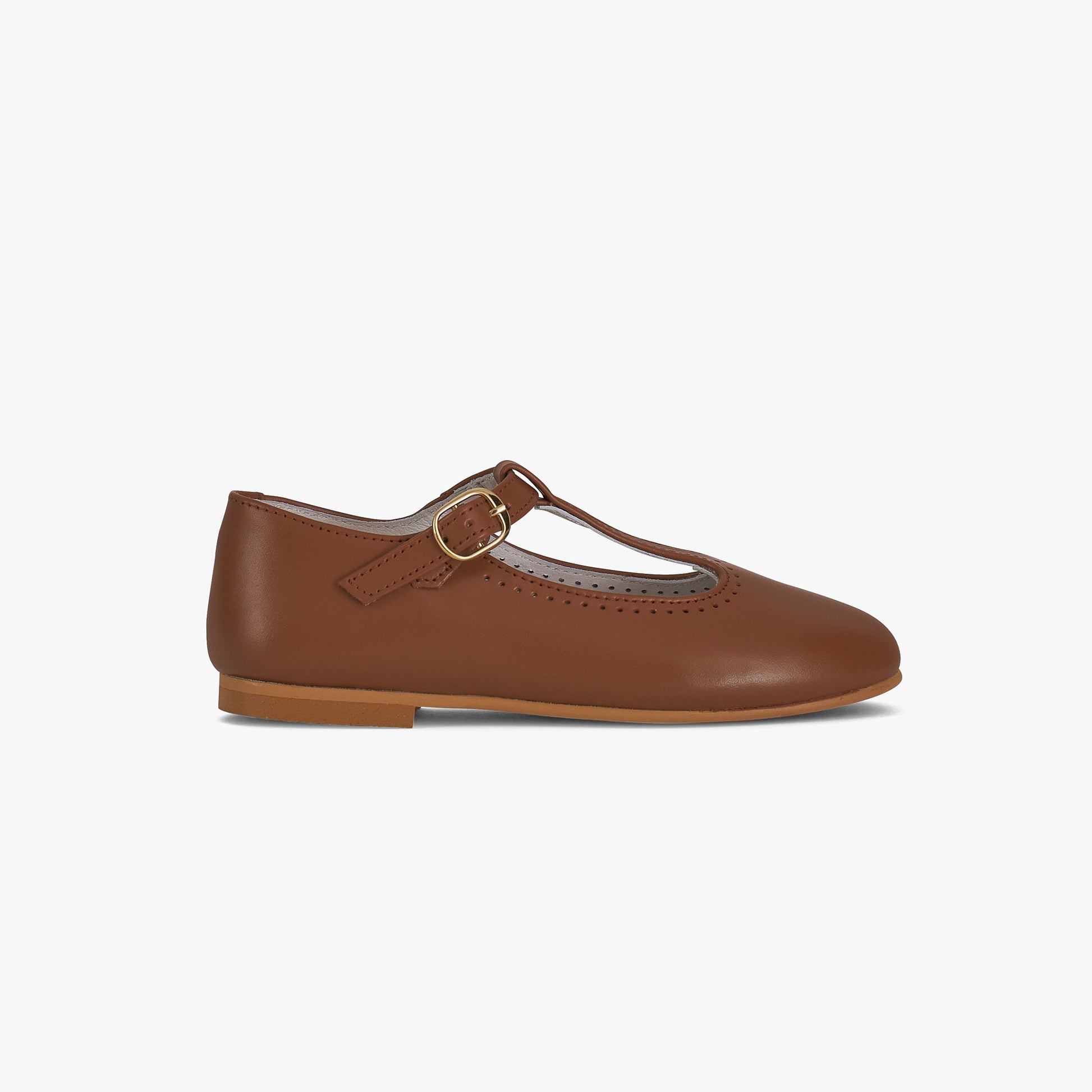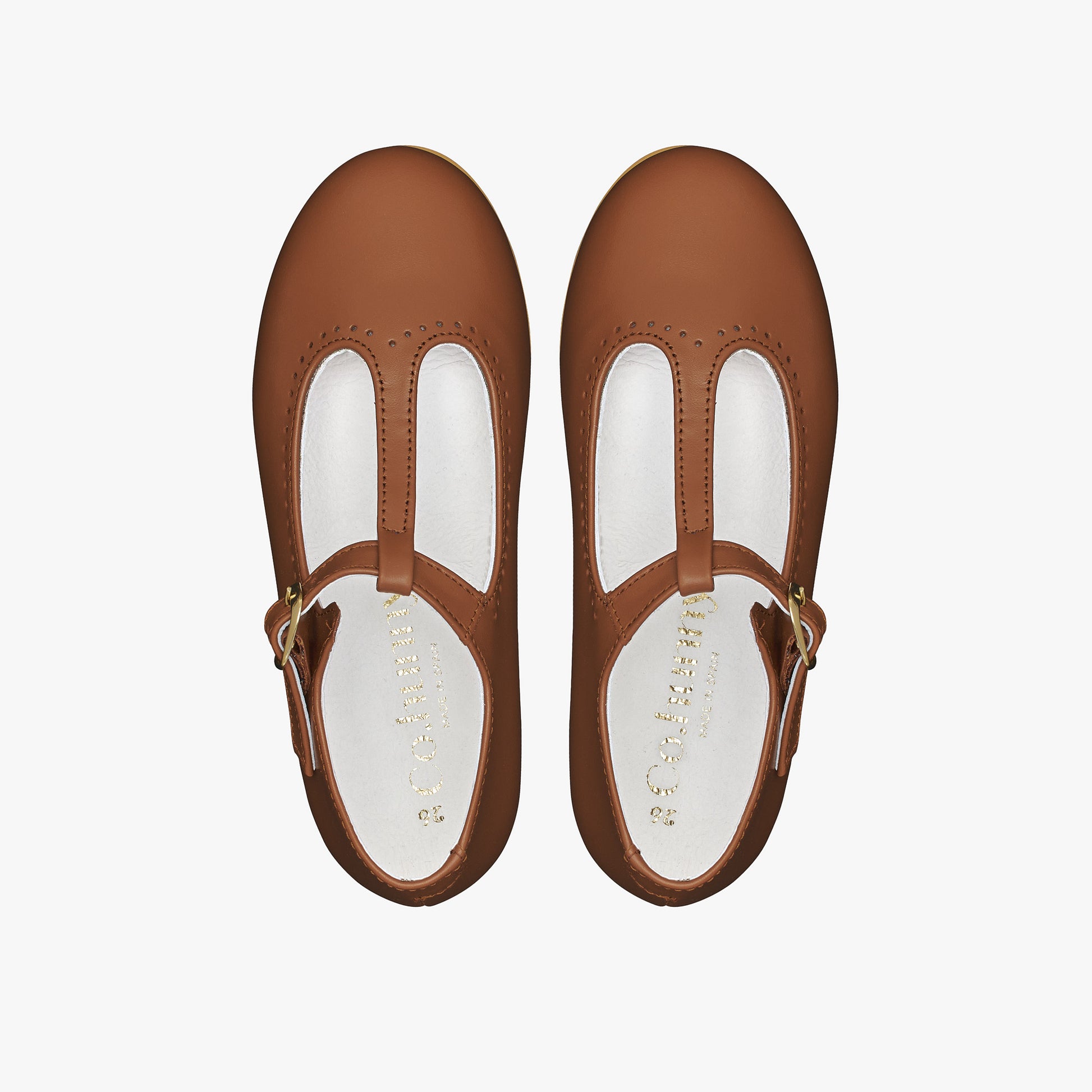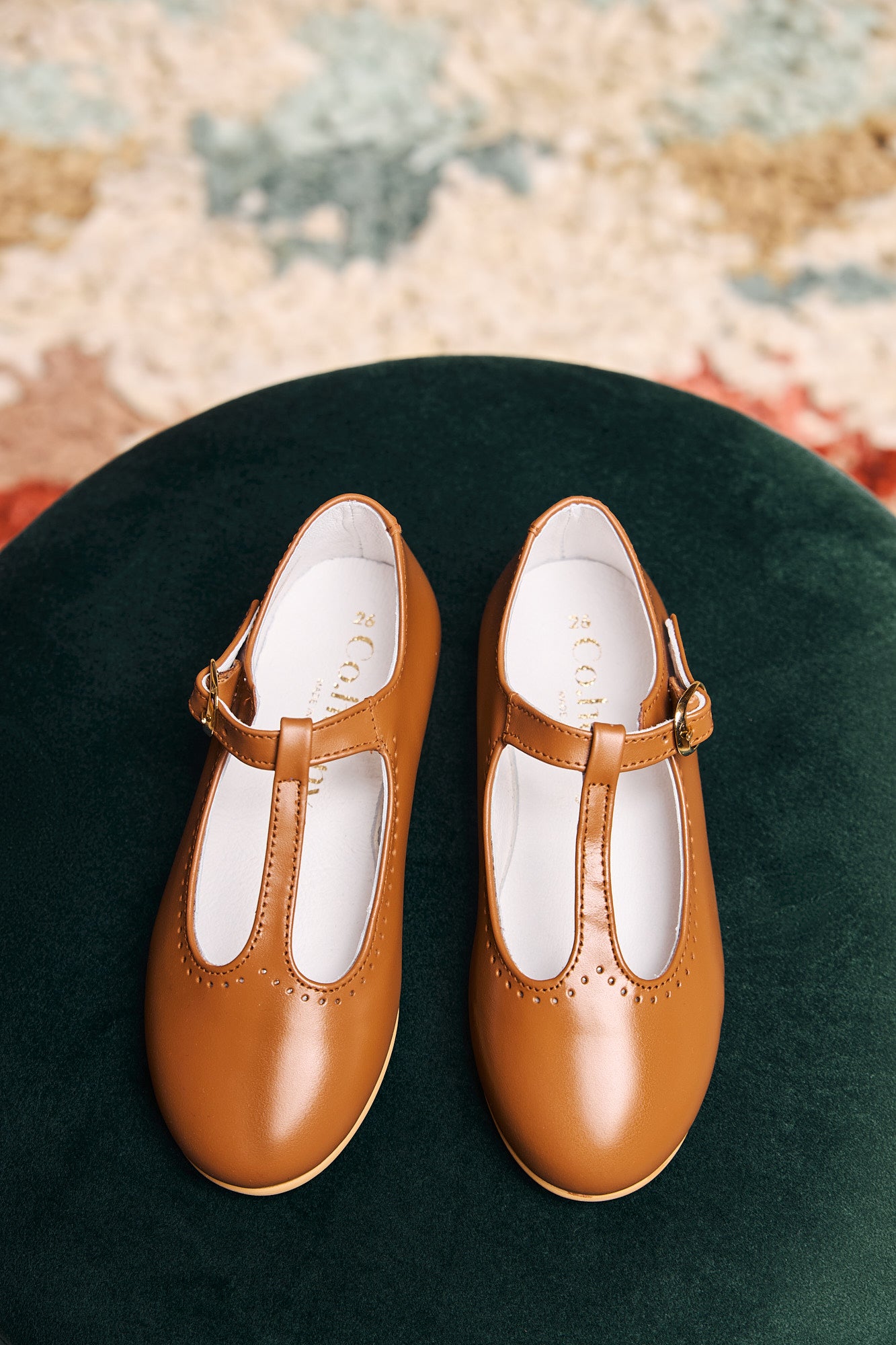 Buty Mary Jane z paskiem w literę T w kolorze koniaku