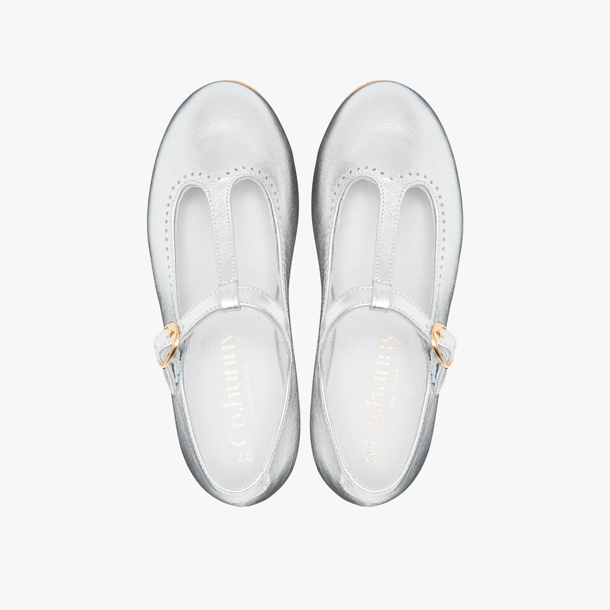 Te tradycyjne półbuty typu Mary Jane dla dzieci zostały wykonane z pięknej, miękkiej skóry w odcieniu srebrnym. Wyściełane podbicie oraz pasek z zapięciem na klamrę gwarantują wygodę i pewność na stopach Twojego dziecka. To idealne obuwie dla małych dziewczynek szczególnie na wiosnę i lato, ale fantastycznie sprawdzą się także na zimowe specjalne okazje jak np. święta, nowy rok czy karnawał. Buty idealnie pasują także do białej sukienki na Komunię Świętą lub kreacji na śluby i wesela.