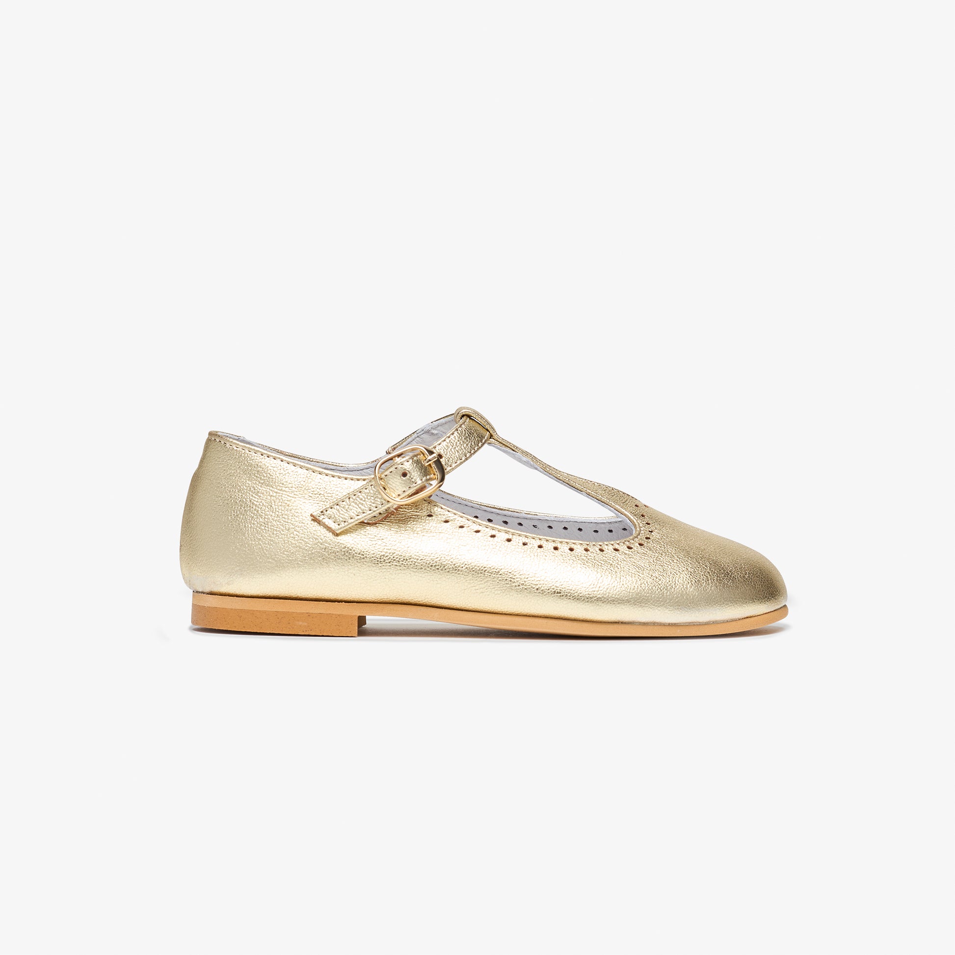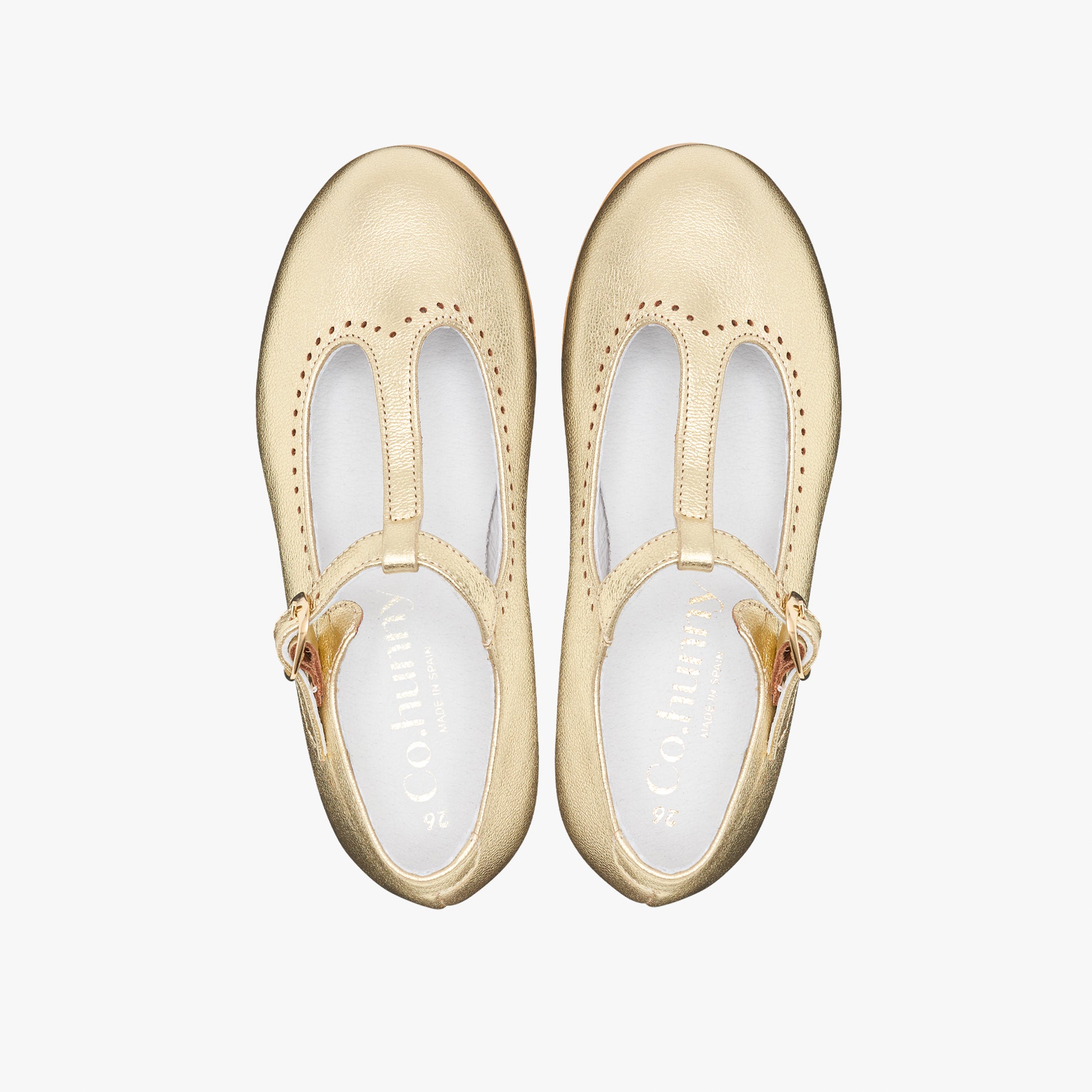 Te tradycyjne półbuty typu Mary Jane dla dzieci zostały wykonane z pięknej, miękkiej skóry w odcieniu złotym. Wyściełane podbicie oraz pasek z zapięciem na klamrę gwarantują wygodę i pewność na stopach Twojego dziecka. To idealne obuwie dla małych dziewczynek szczególnie na wiosnę i lato, ale fantastycznie sprawdzą się także na zimowe specjalne okazje jak np. święta, nowy rok czy karnawał. Buty idealnie pasują także do białej sukienki na Komunię Świętą lub kreacji na śluby i wesela.