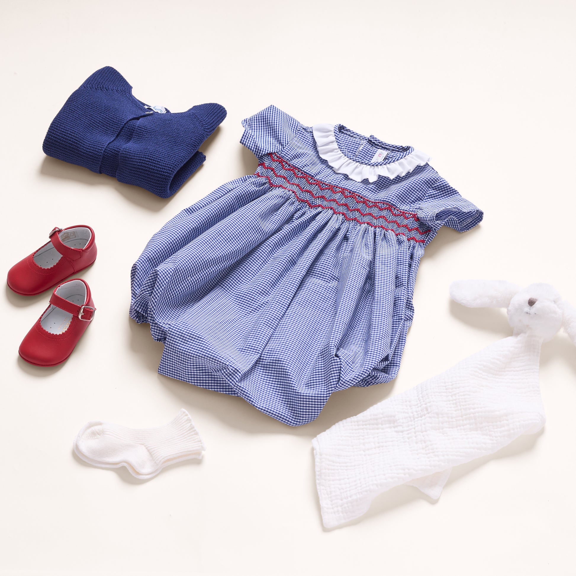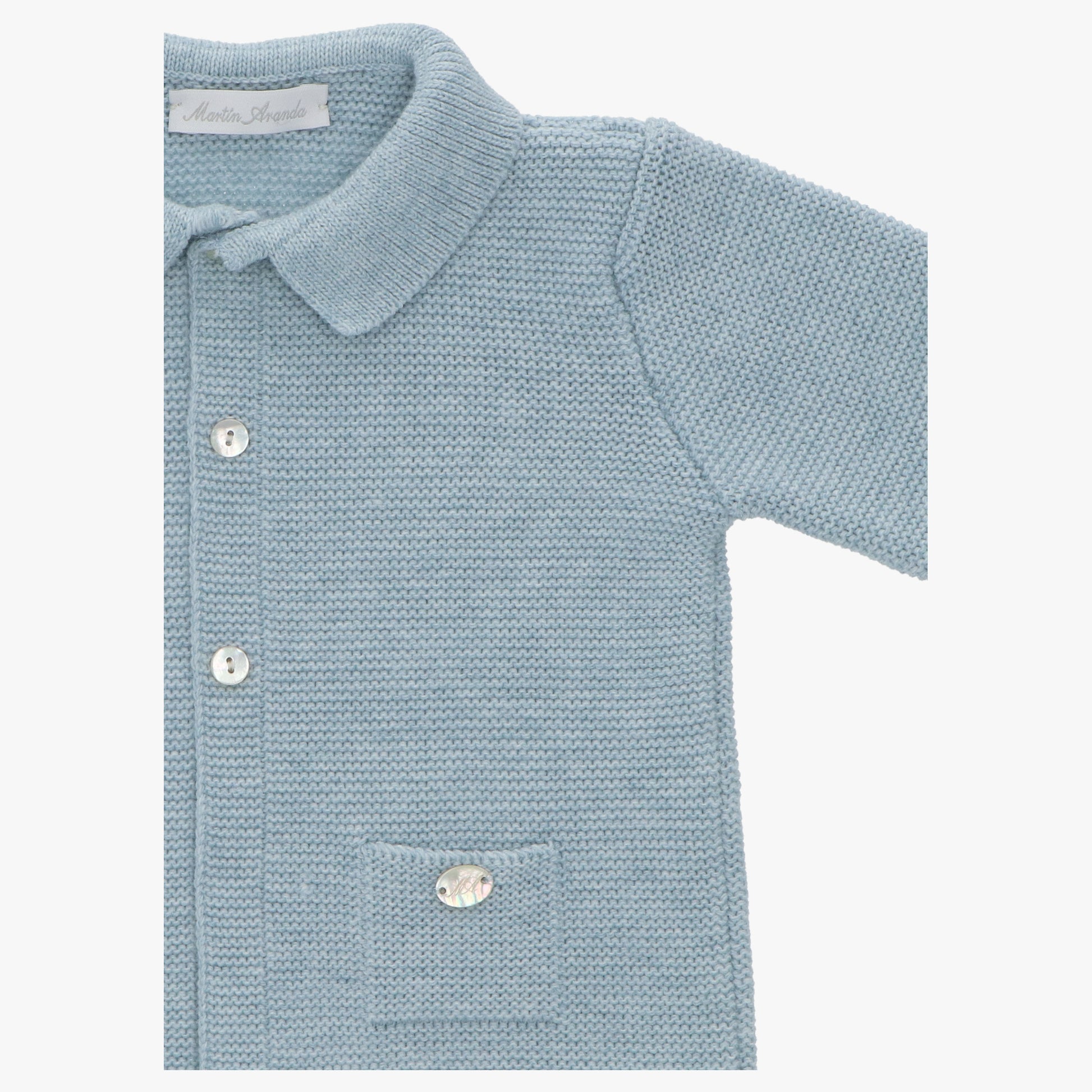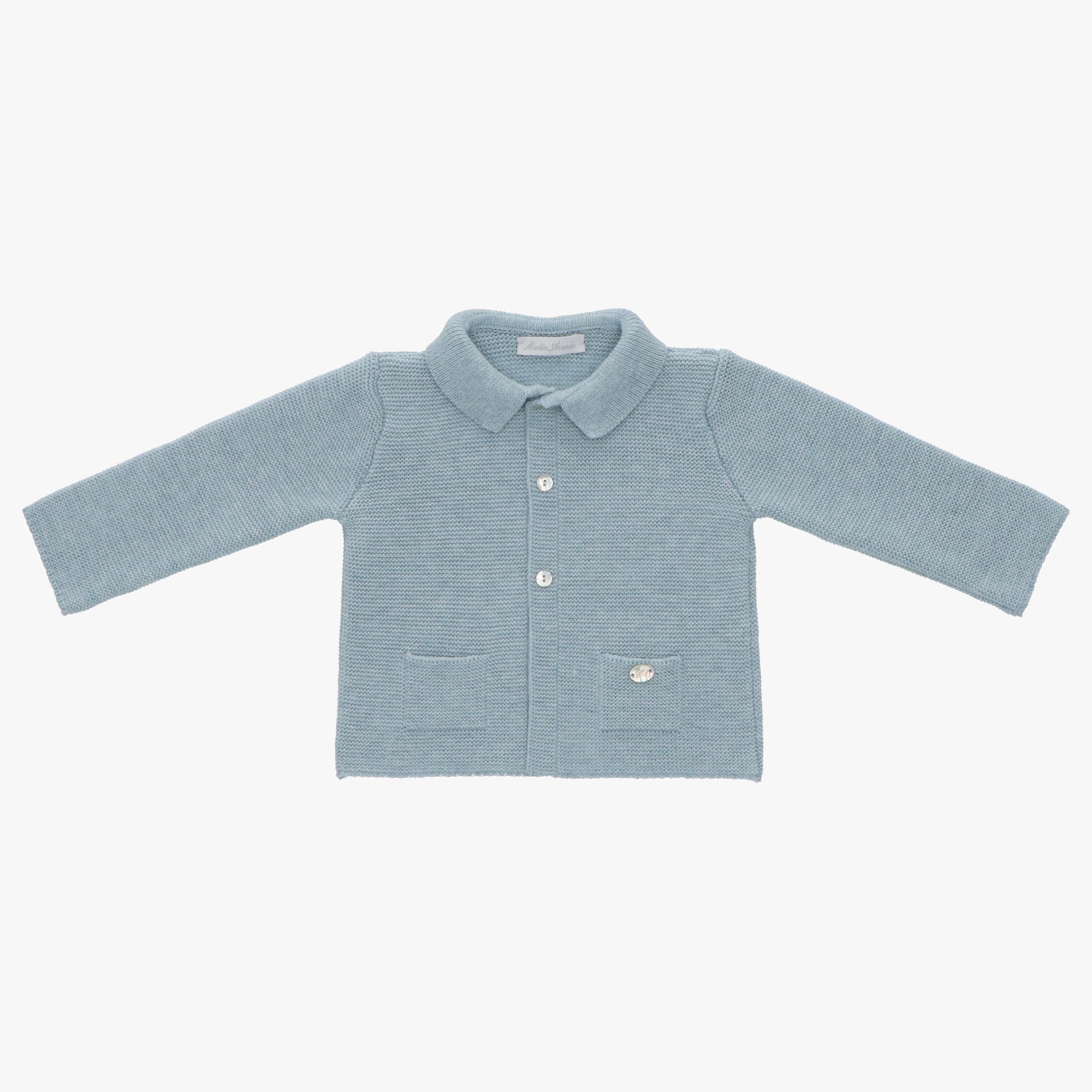 Elegancki błękitny kardigan dla chłopca, idealny na wyjątkowe okazje, takie jak urodziny czy rodzinne spotkania. Sweterek zapinany na guziczki, wykonany z najwyższą starannością w małej rodzinnej manufakturze w Hiszpanii.