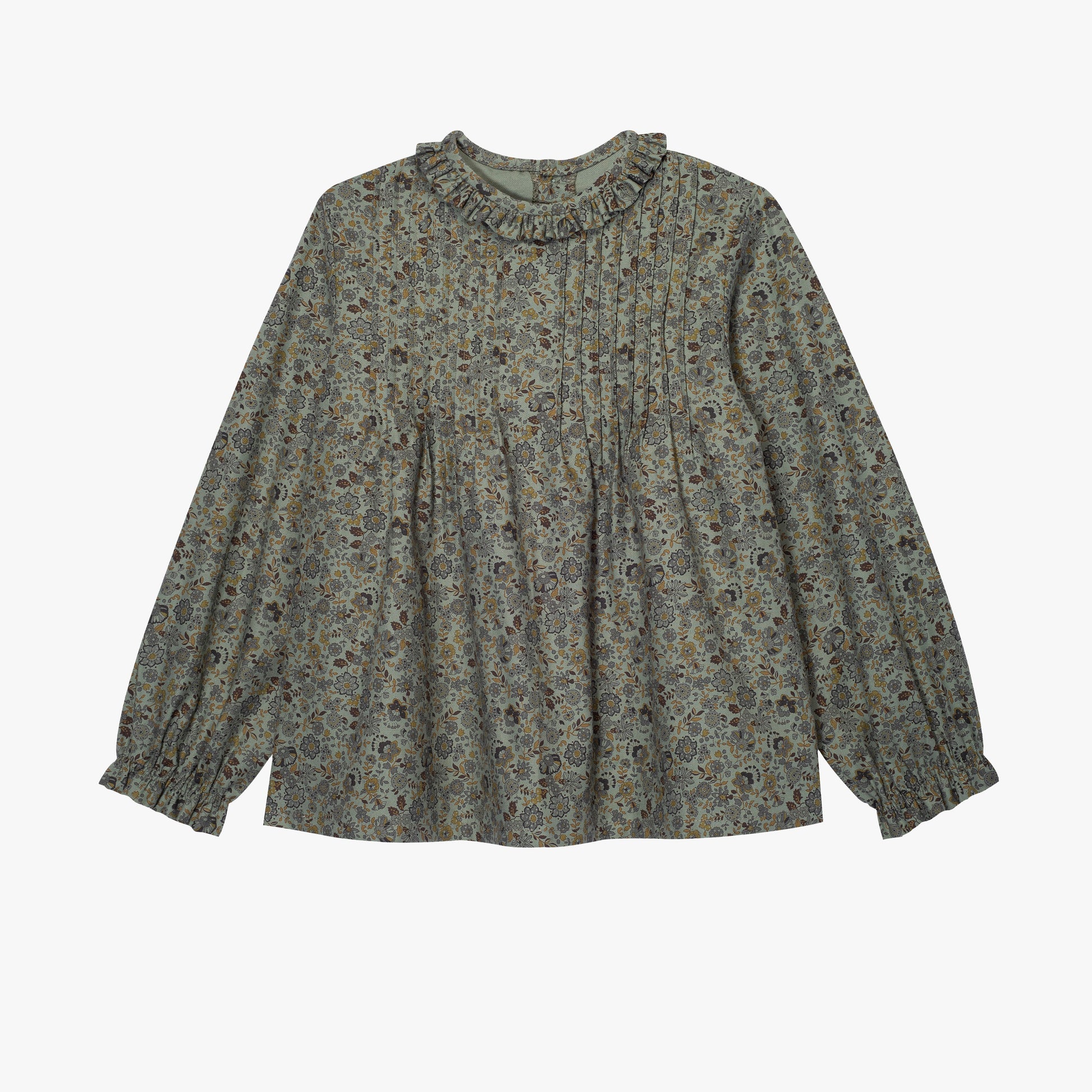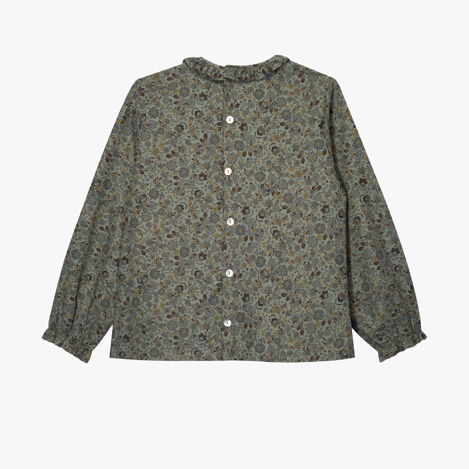 Oliwkowa koszula Olive wykonana jest w 100% z bawełny. Zapinana na guziczki z tyłu. Ma piękny kołnierzyk, który dodaje uroku oraz niebanalny wzór w kwiatuszki. Jej zielony kolor jest idealny zarówno na jesień jak i zimę a zwłaszcza do świątecznych stylizacji.