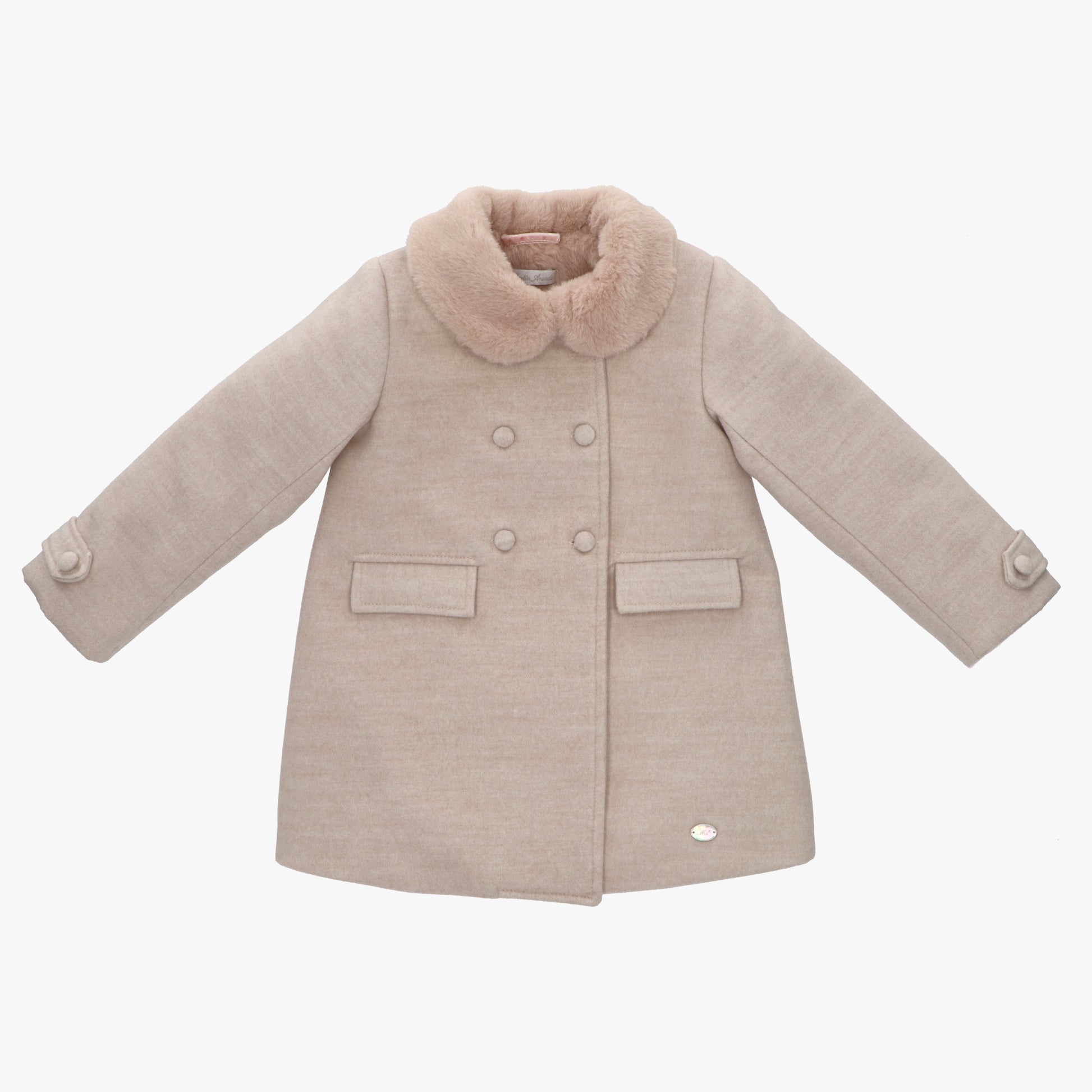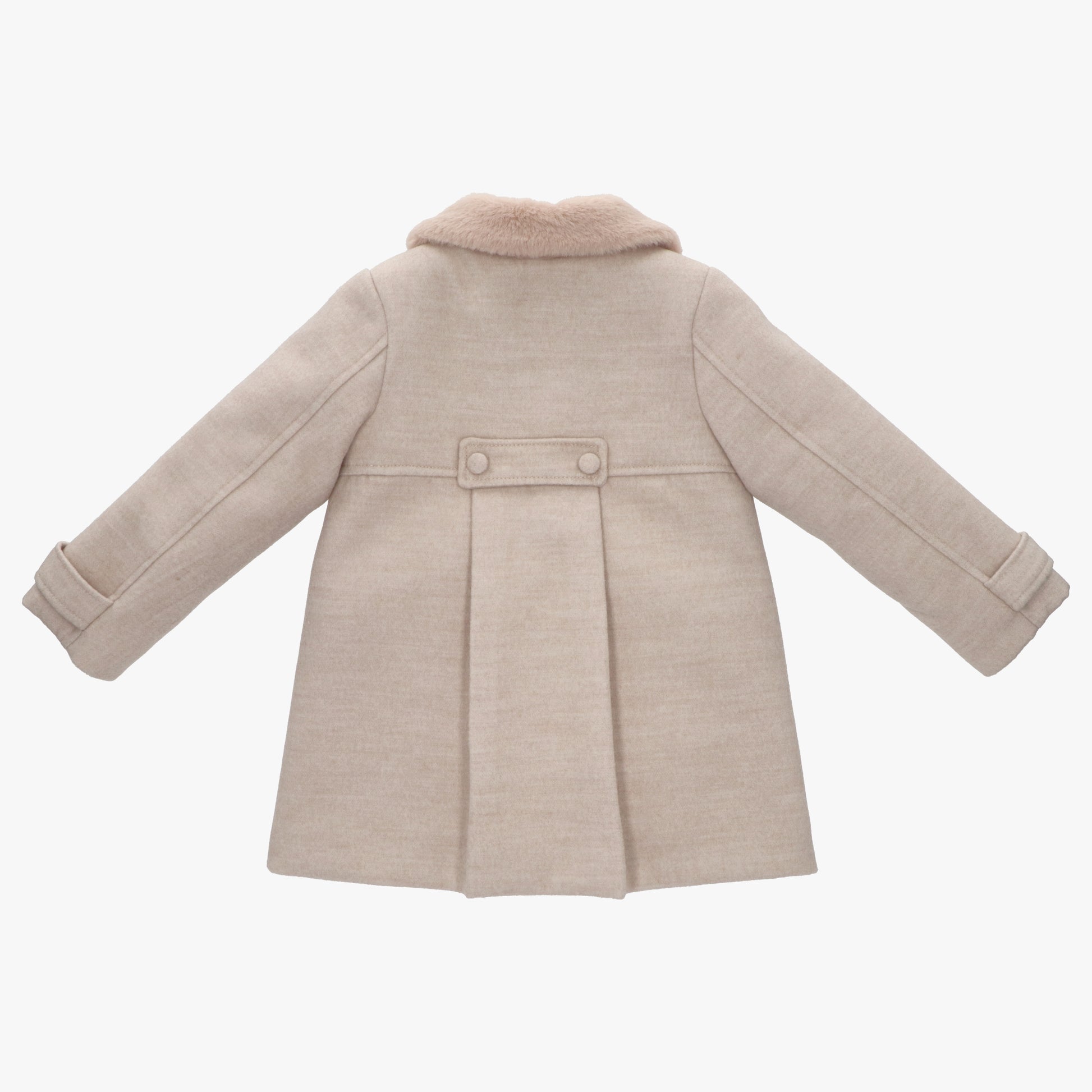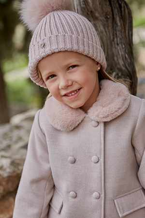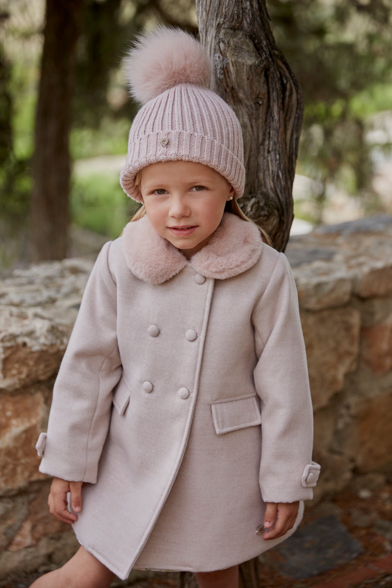 Różowy, klasyczny płaszcz dziewczęcy z futerkowym kołnierzem