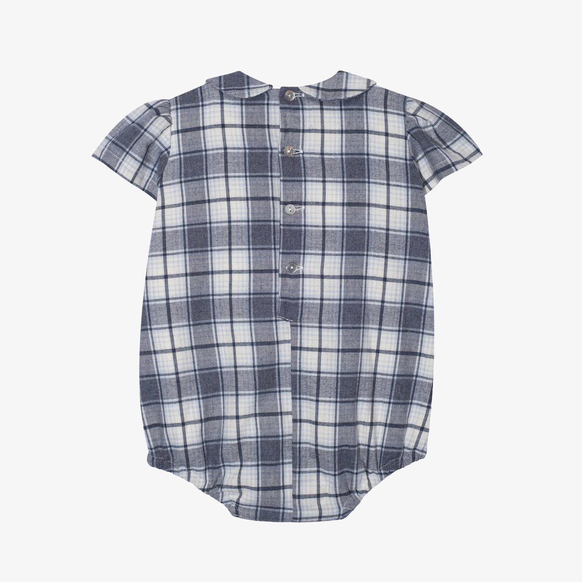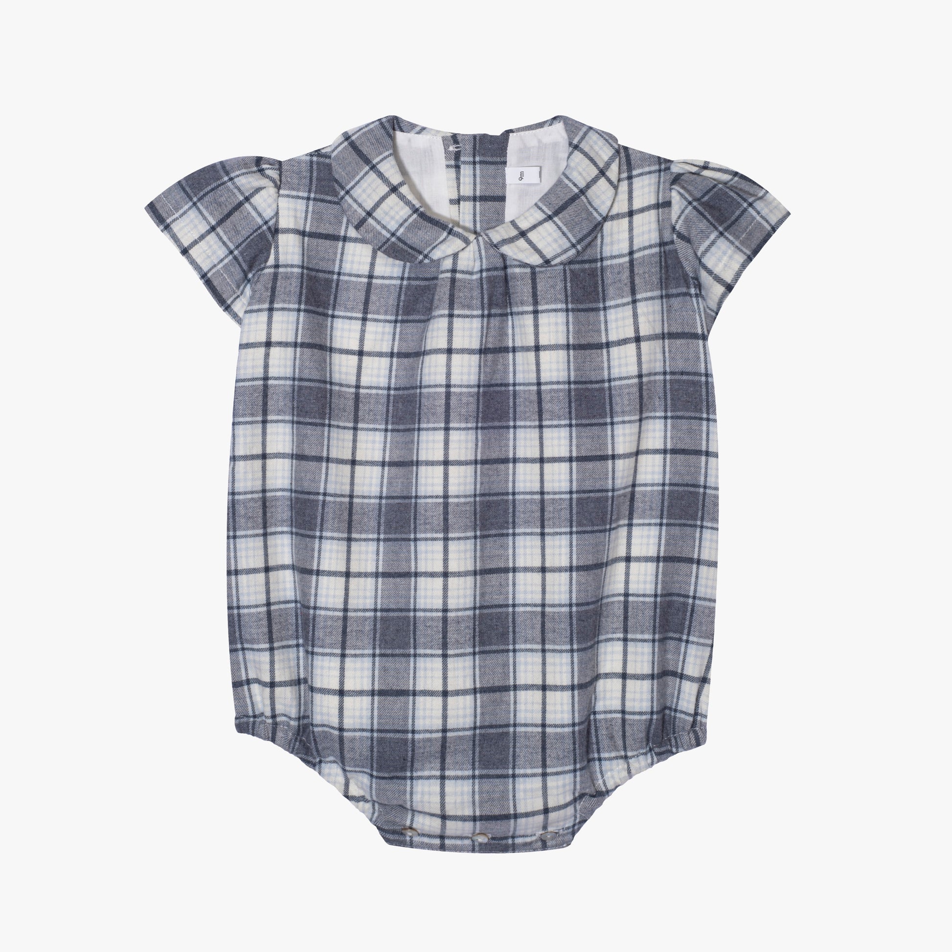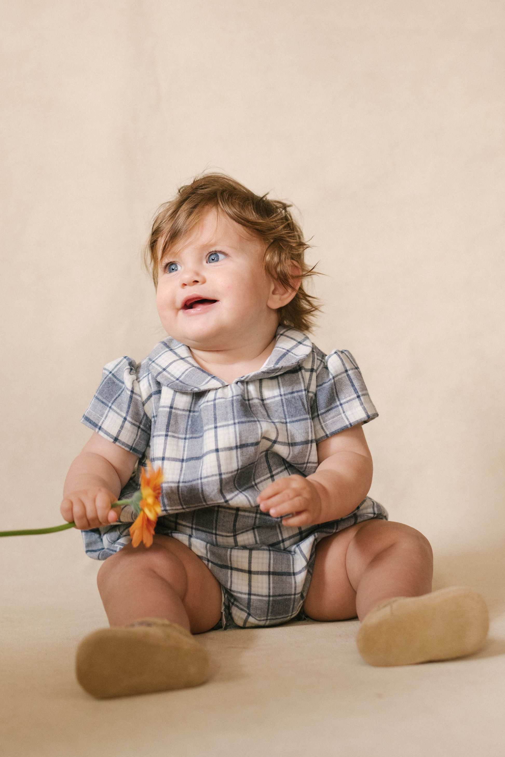 Stylowy rampers z uroczym kołnierzykiem typu Peter Pan w biało-niebieską kratkę to kwintesencja klasycznego designu w dziecięcej garderobie. Wykonany w 100% z miękkiej i ciepłej bawełnianej flaneli, zapewnia komfort i idealne dopasowanie zarówno chłopcom, jak i dziewczynkom.