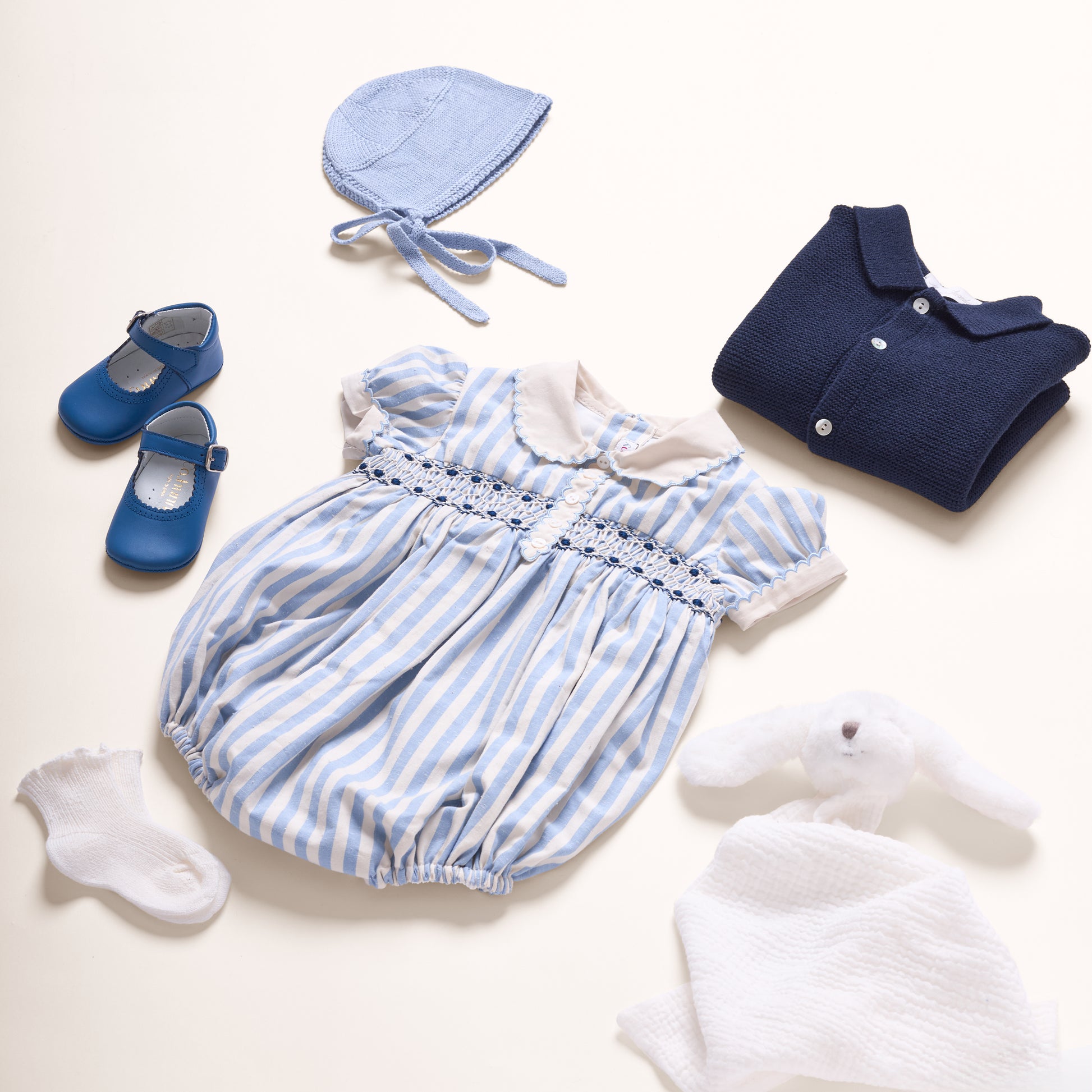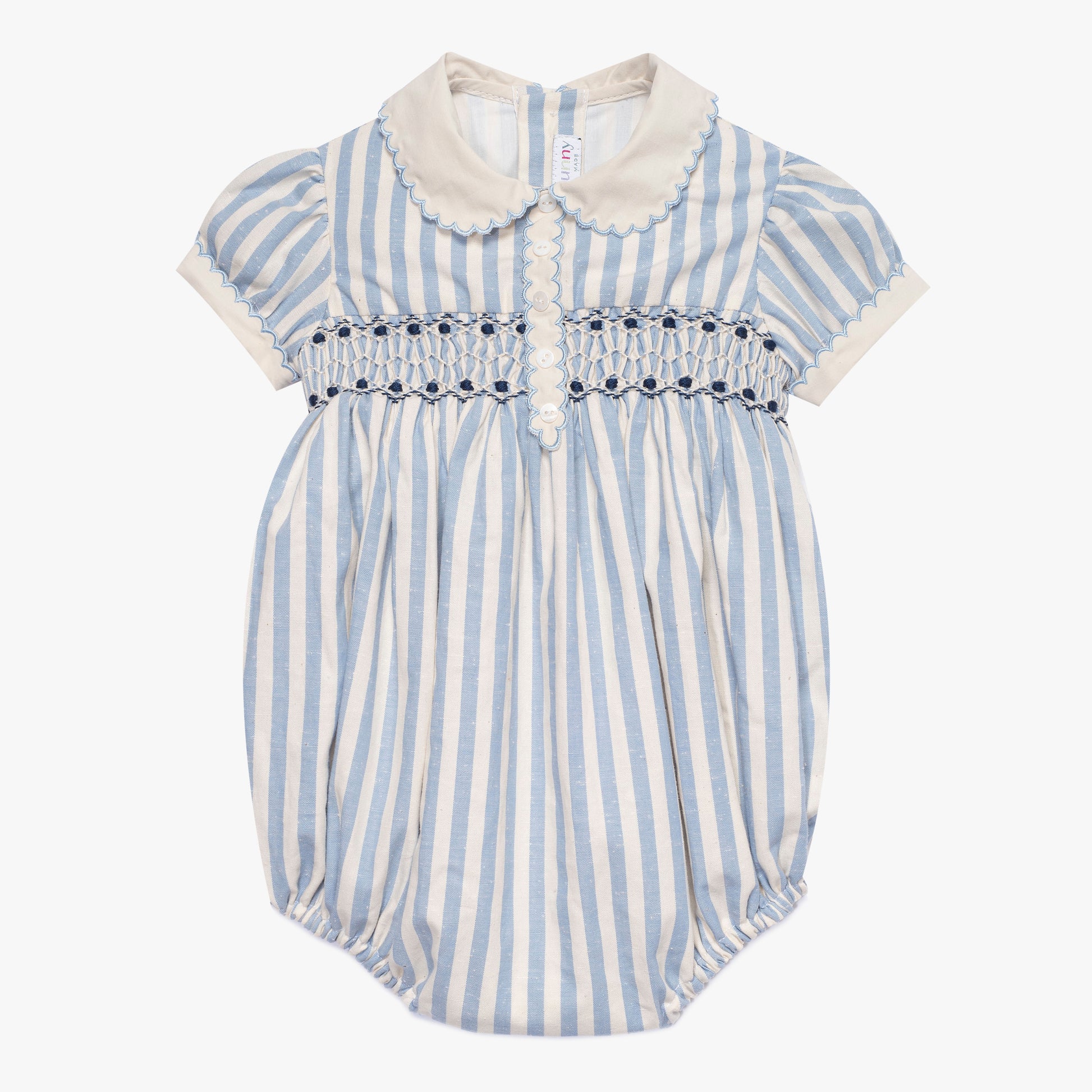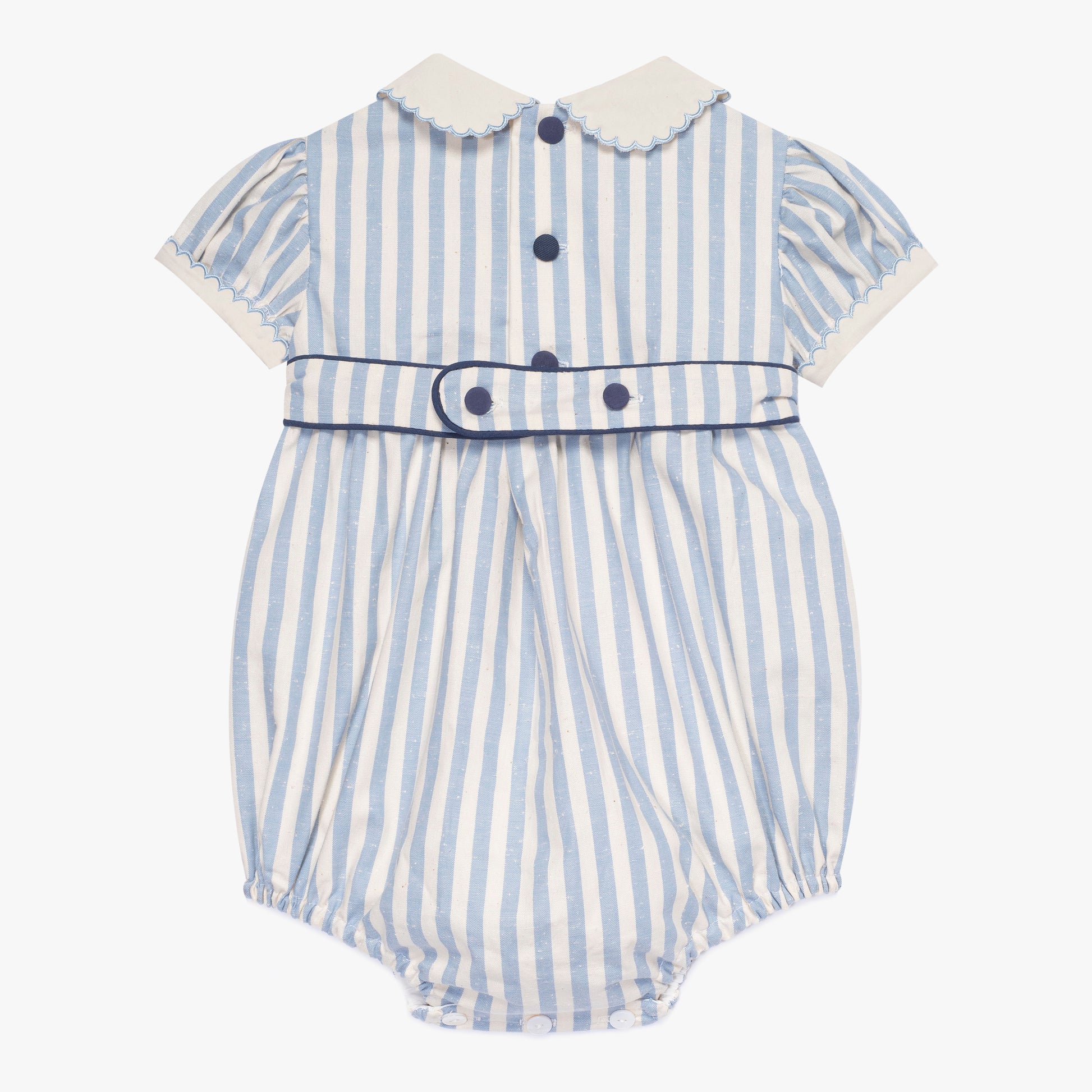 Wykonany z najwyższej jakości materiałów, luksusowy błękitno-biały rampers niemowlęcy to idealny strój na chrzest. Miękki w dotyku, zapewnia delikatne i wygodne otulenie dla delikatnej skóry Twojego dziecka. Ten kombinezon to elegancki strój dla dzieci, z ręcznym marszczeniem i tradycyjnym, haftowanym kołnierzykiem Peter Pan, co czyni go klasycznym ubraniem dla niemowląt. Zawiera charakterystyczne detale wykonane ręcznie, które prezentują złożone wzory, odzwierciedlające nasze zaangażowanie w rzemieślnicze rzemiosło. Kolor i wzór są uniwersalne, pasujące zarówno dla chłopca, jak i dziewczynki, co sprawia, że jest to tradycyjny strój dla chłopca i dziewczynki. Idealny na specjalne okazje, takie jak wesela, komunie czy pierwsze urodziny. Delikatne kolory i białe dodatki sprawiają, że to biało-niebieskie ubranko na chrzest będzie doskonałym wyborem.