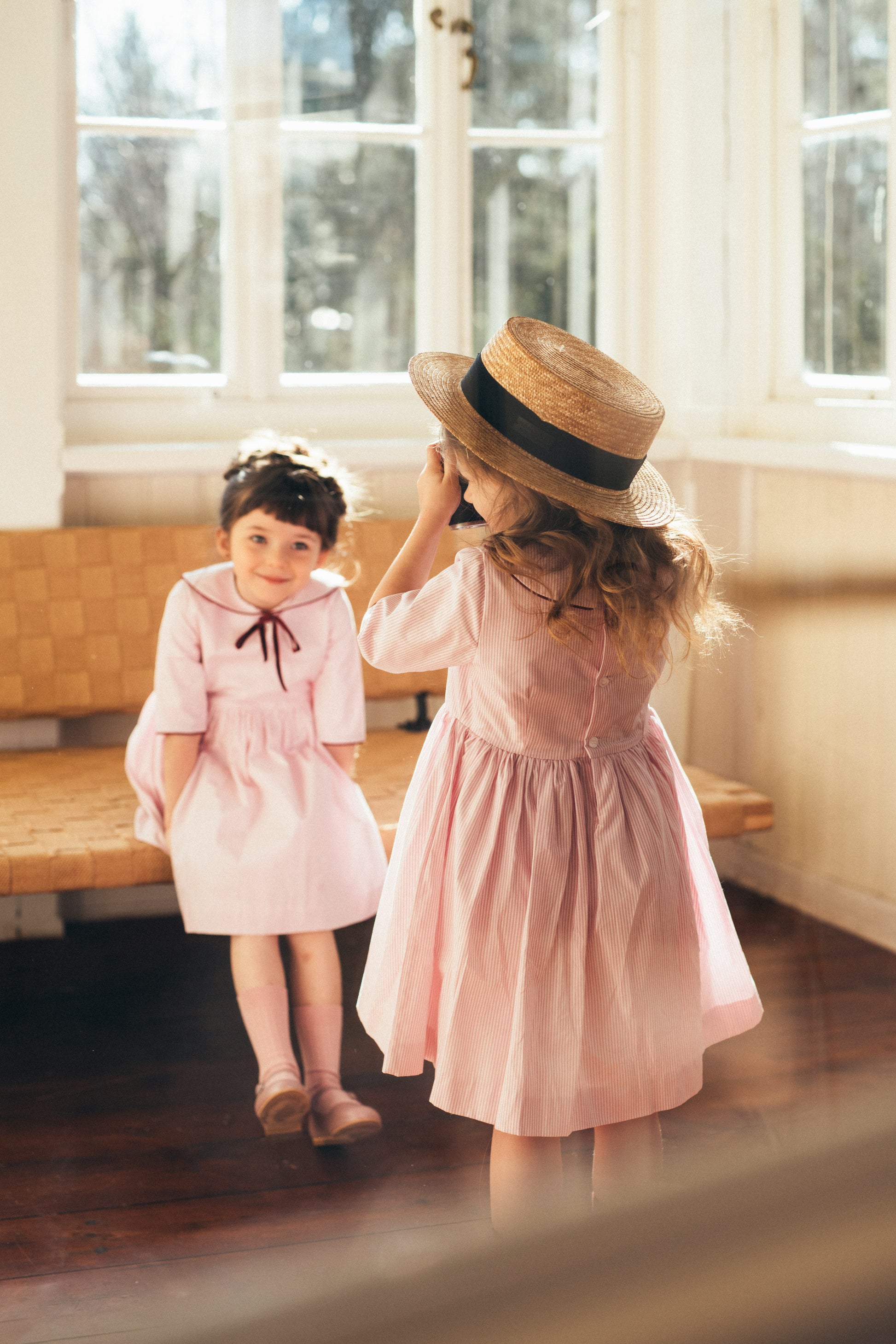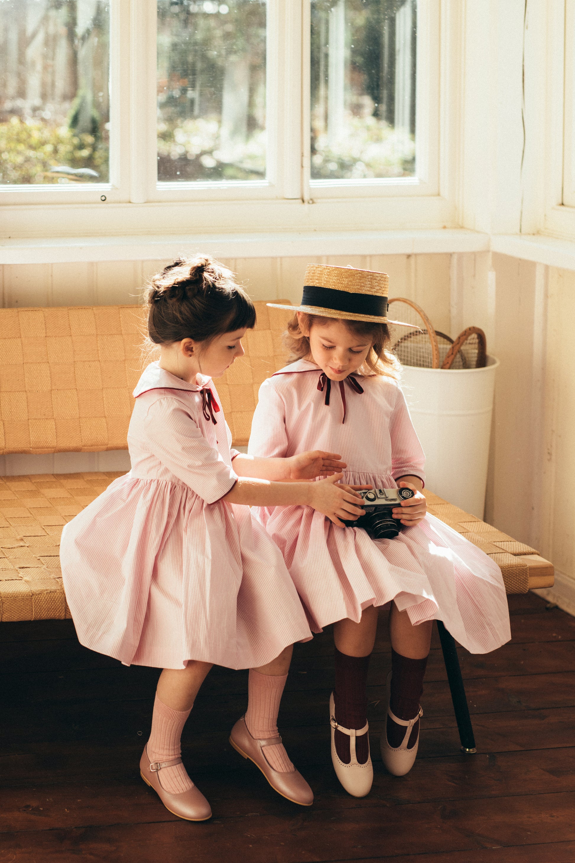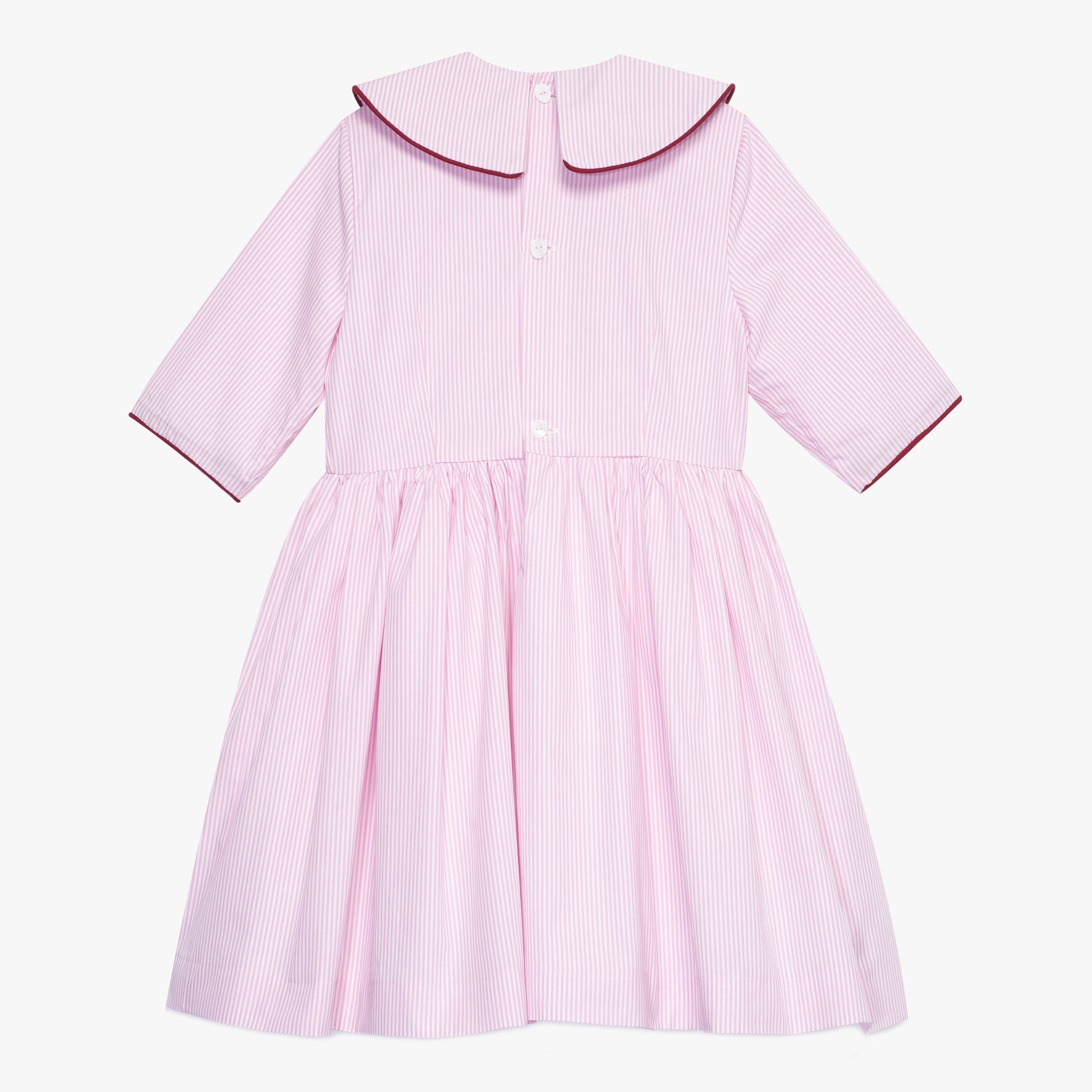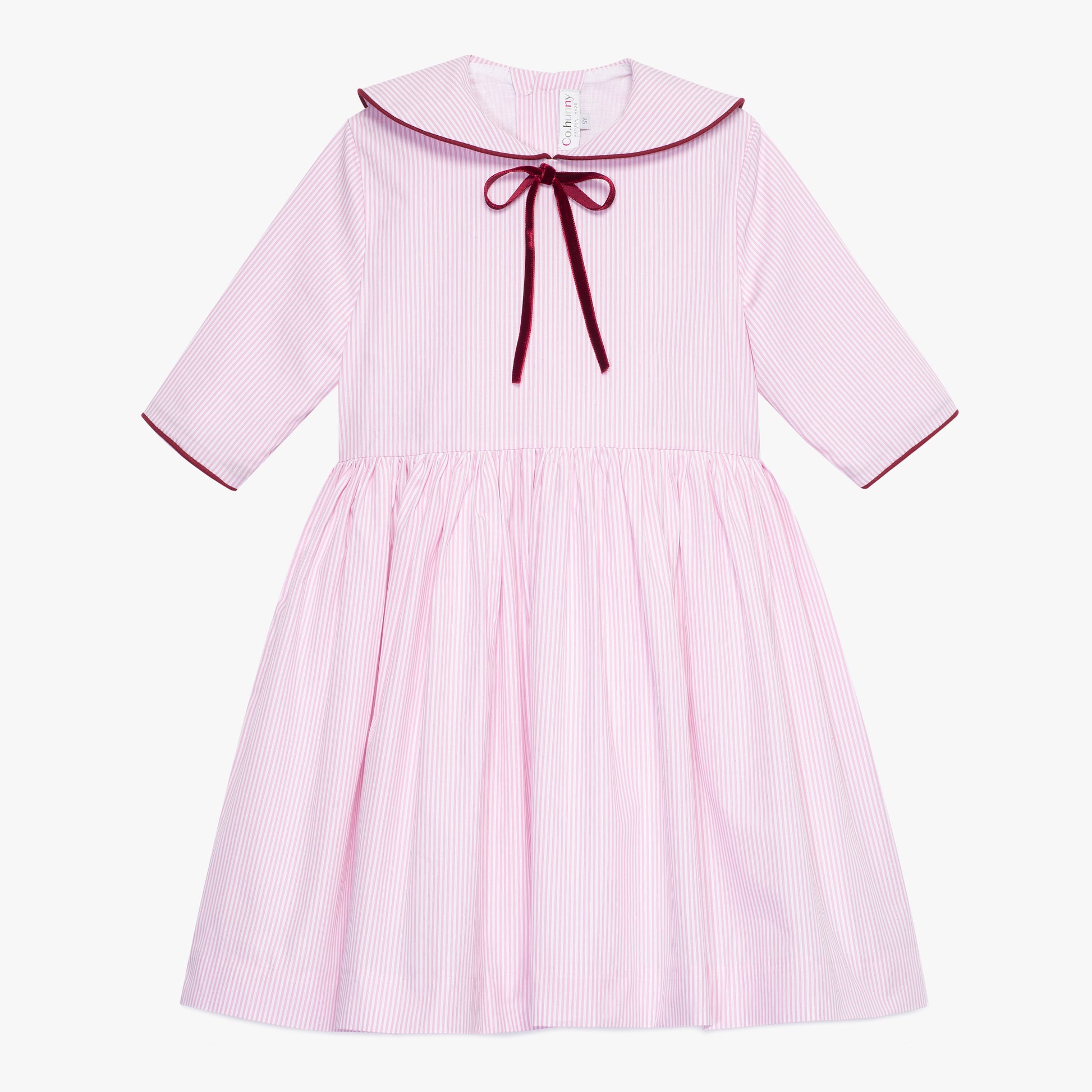 Różowa sukienka w paski, z kołnierzykiem i kokardką