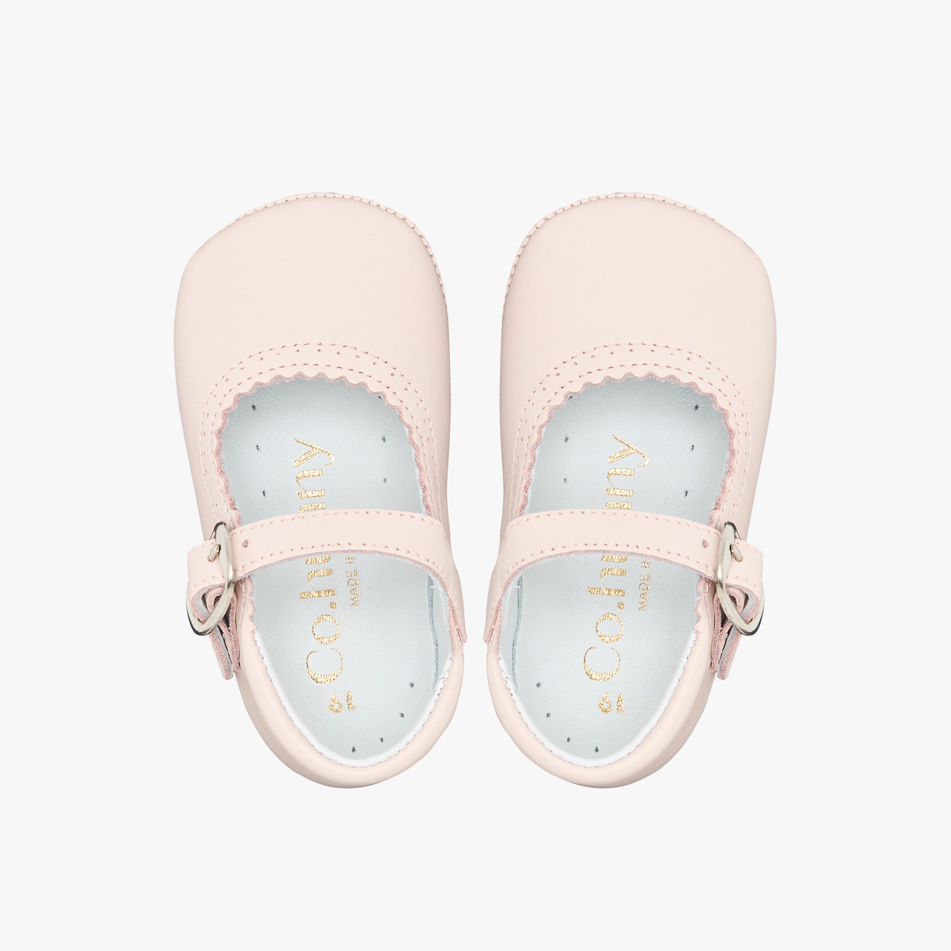 Różowe buty mary jane dla niemowląt są doskonałe dla maluszków, które nie potrafią jeszcze chodzić. Wykonane przez rzemieślników z najwyższej jakości skóry Nappa, są lekkie i posiadają elastyczną skórzaną podeszwę, zapewniając dodatkowy komfort. Buty są w całości wyścielane skórą i posiadają pasek z klamrą. To doskonały prezent dla nowonarodzonego maluszka. Są idealne jako buciki do chrztu.
