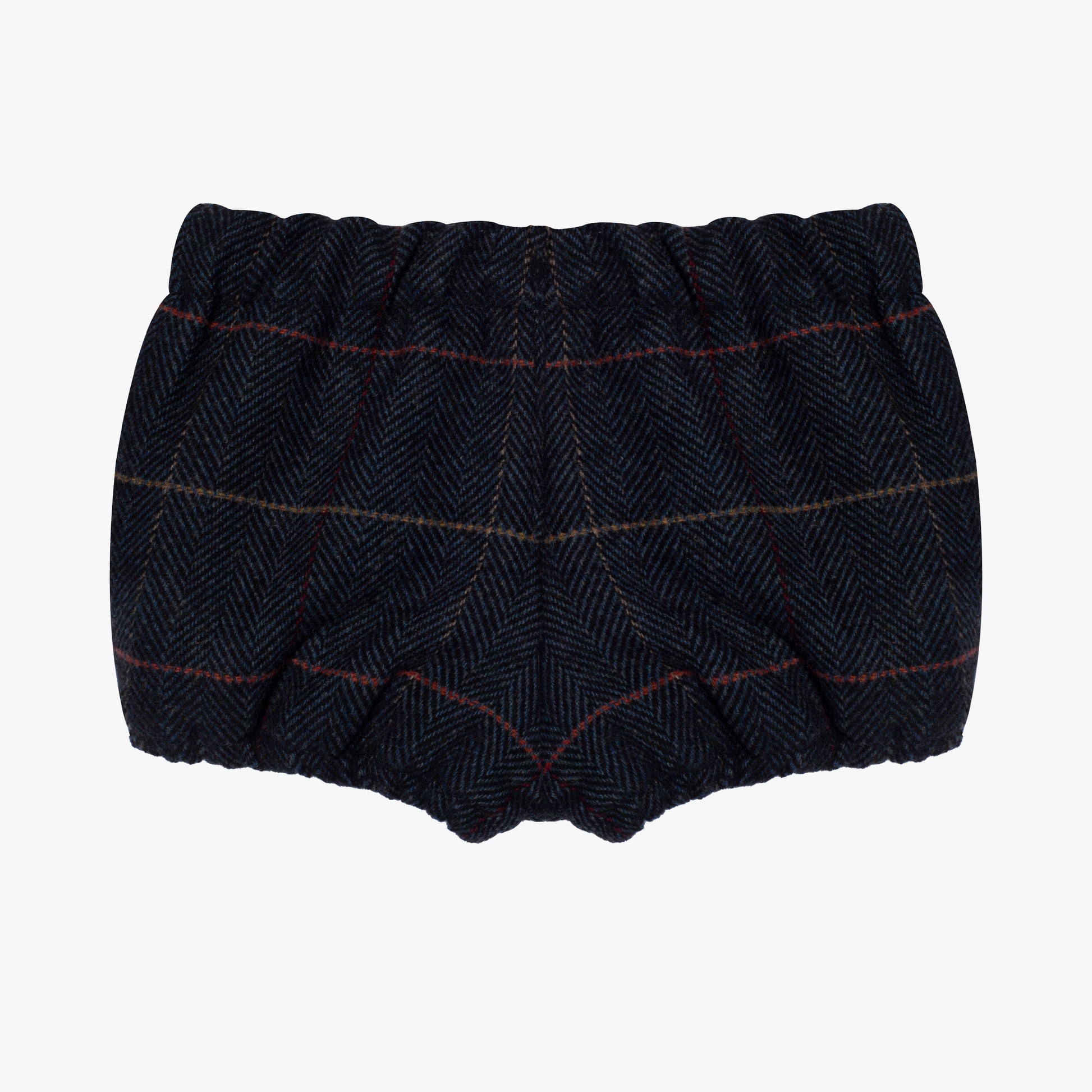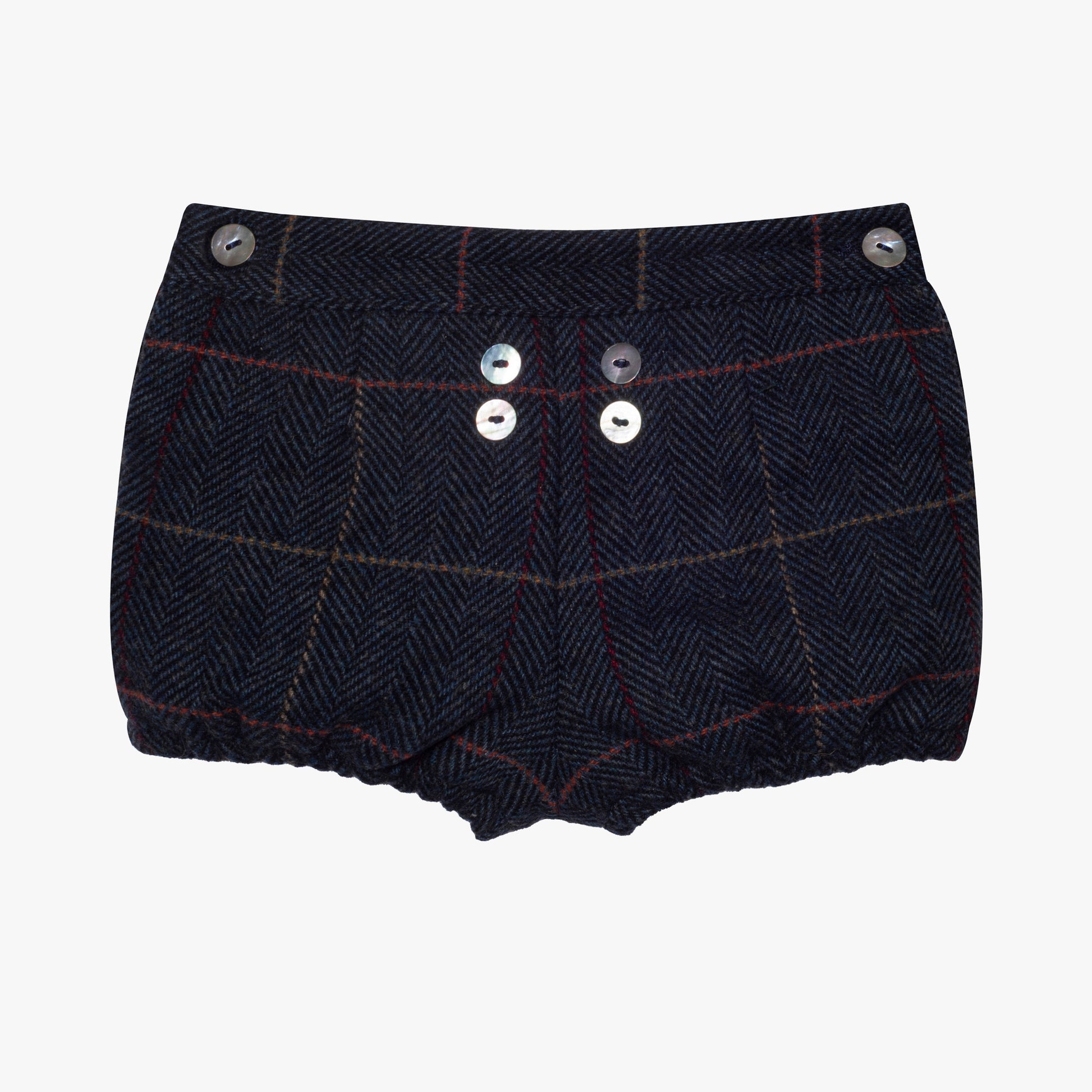 Urocze, eleganckie spodenki dla małego chłopca. Wykonane w 100% z bawełny. Wyjątkowo ciepłe, idealne na święta. W kolorze ciemno szarym w delikatną kratę. Zapinane na guziczki. Idealne dla niemowlaka do rajstopek i koszuli lub sweterka.
