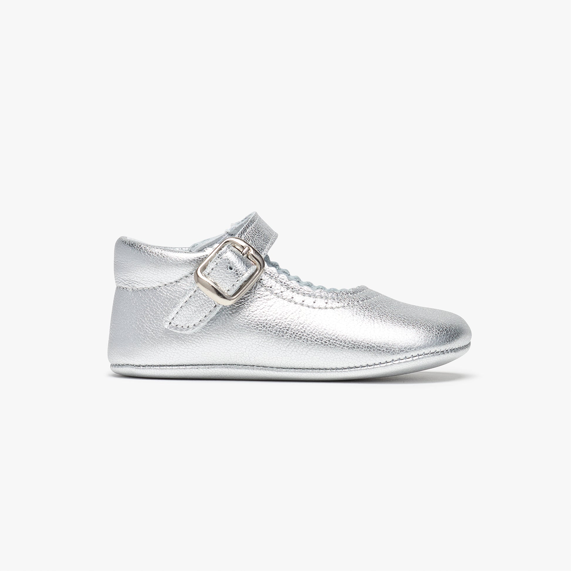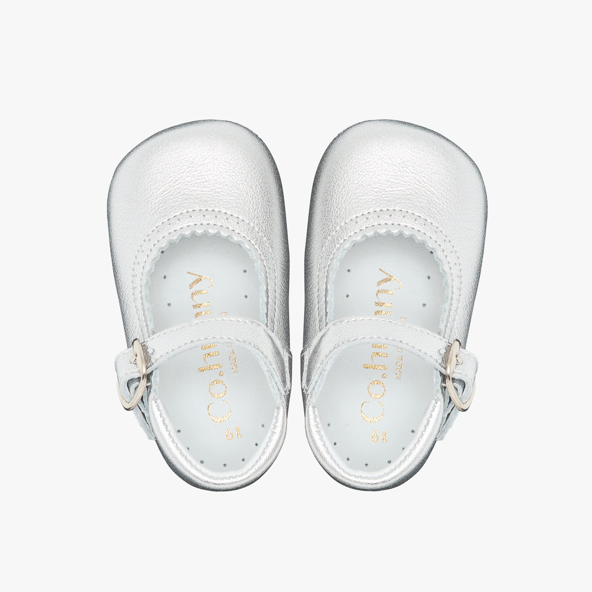 Srebrne buciki mary jane dla niemowląt są doskonałe dla maluszków, które nie potrafią jeszcze chodzić. Wykonane przez rzemieślników z najwyższej jakości skóry Nappa, są lekkie i posiadają elastyczną skórzaną podeszwę, zapewniając dodatkowy komfort. Buty są w całości wyścielane skórą i posiadają pasek z klamrą. To doskonały prezent dla nowonarodzonego maluszka. Są idealne jako buciki do chrztu.