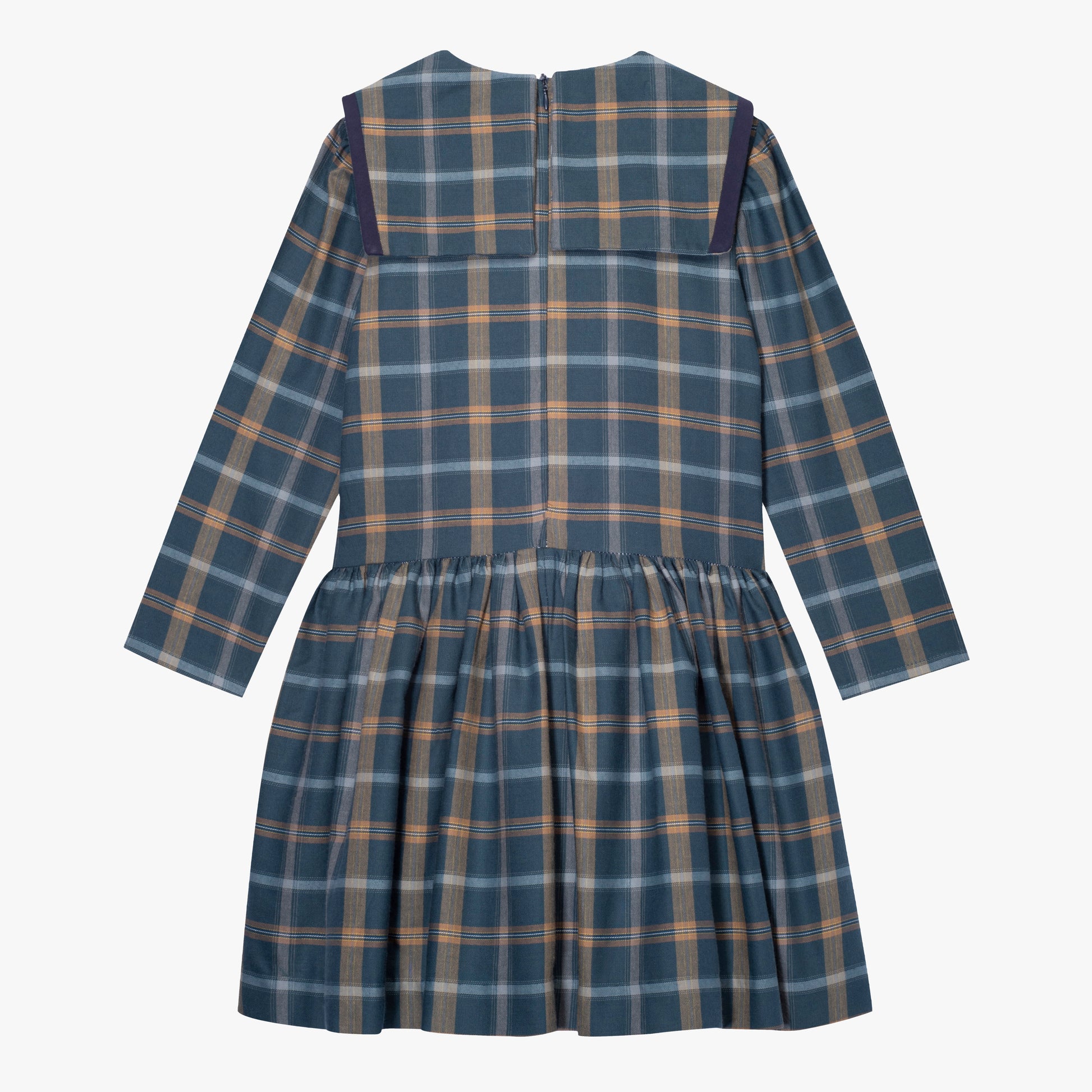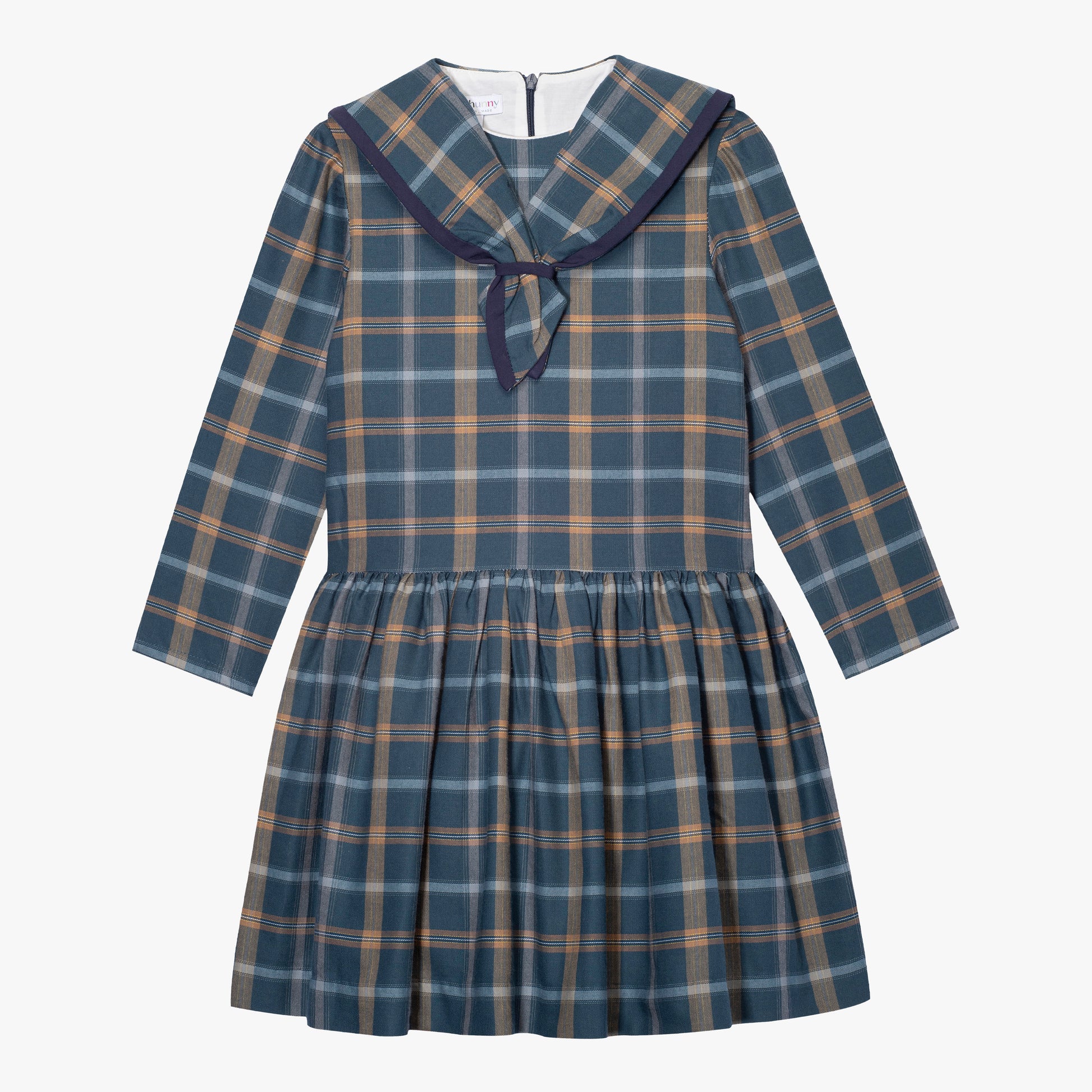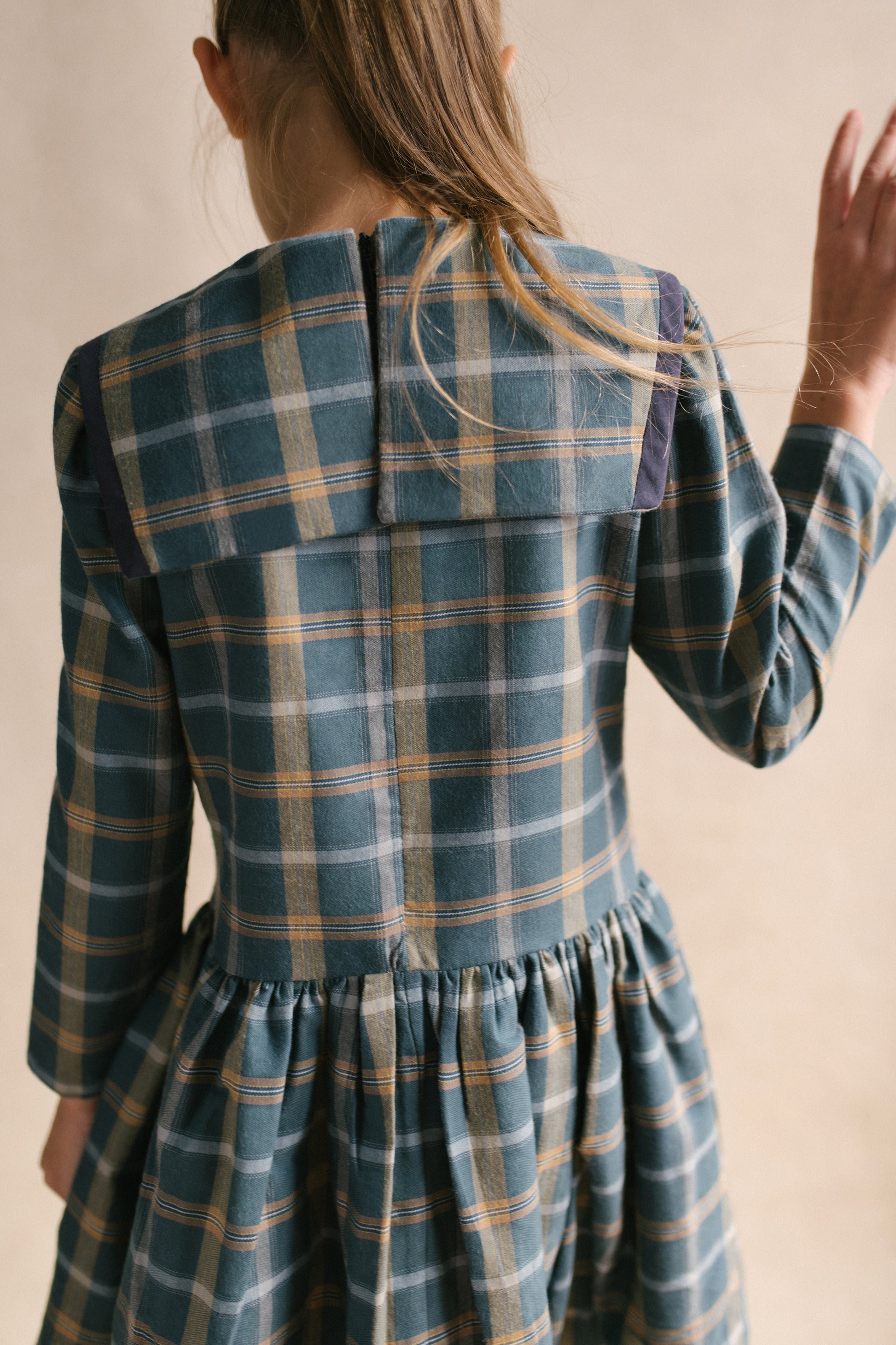 Niebieska sukienka w musztardową kratę dla dziewczynki – klasyka z falbaną w nowoczesnym wydaniu