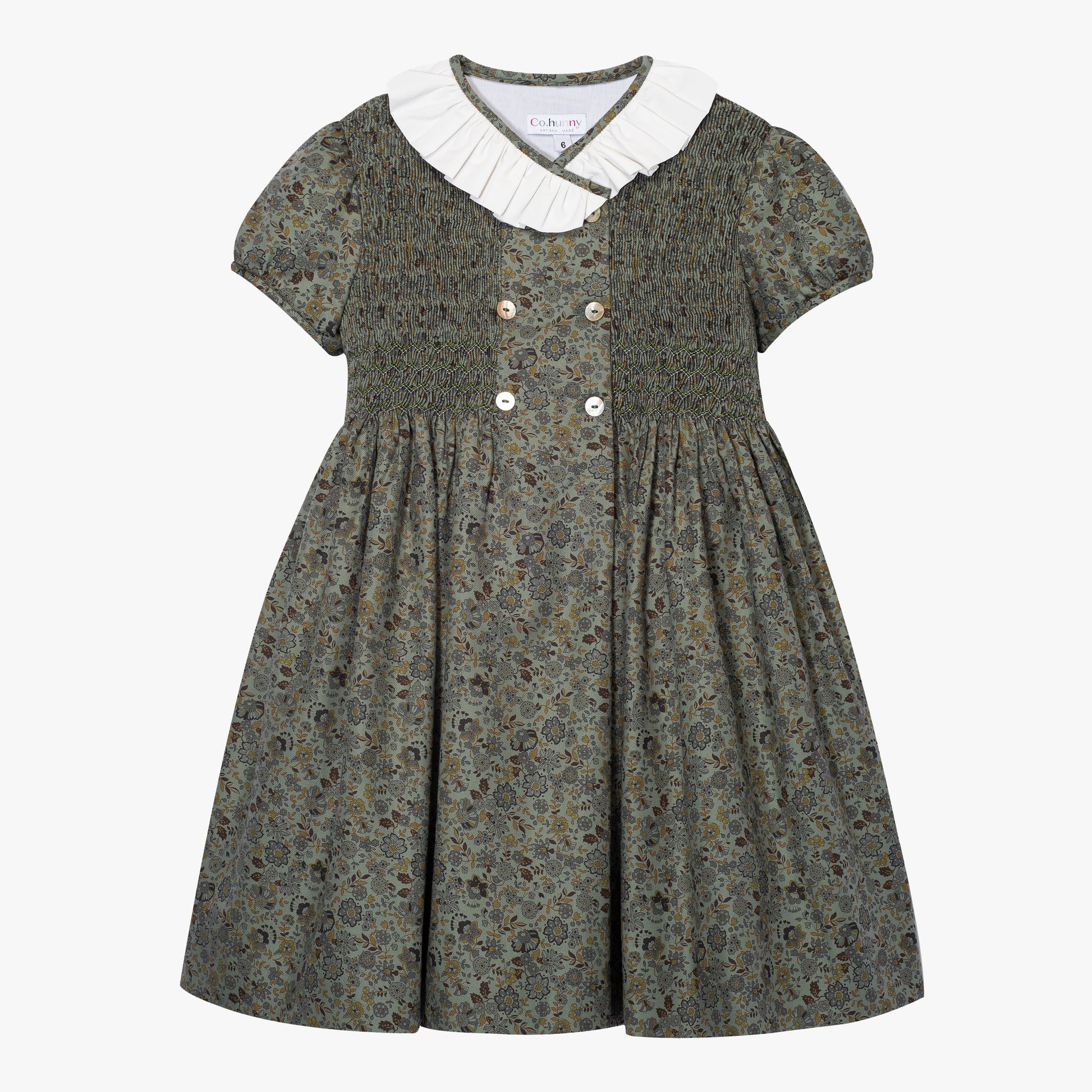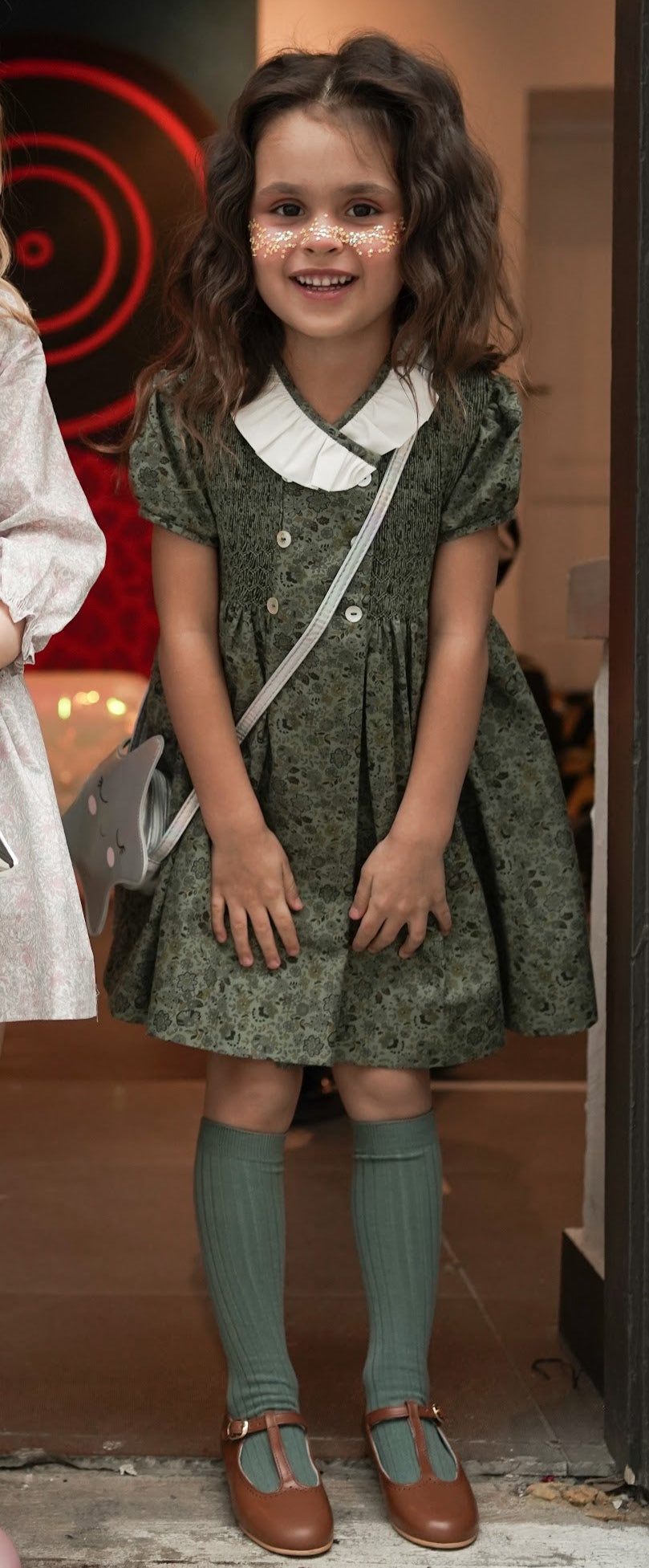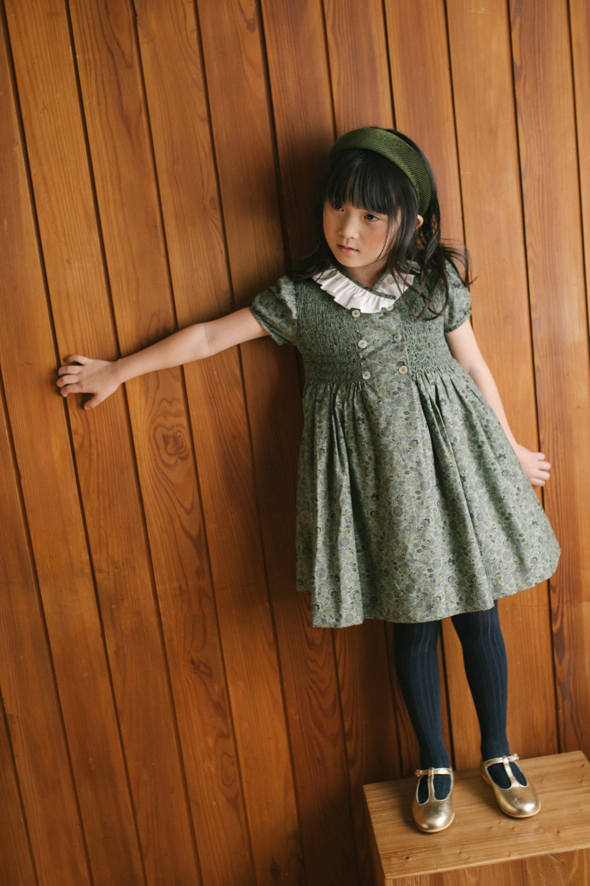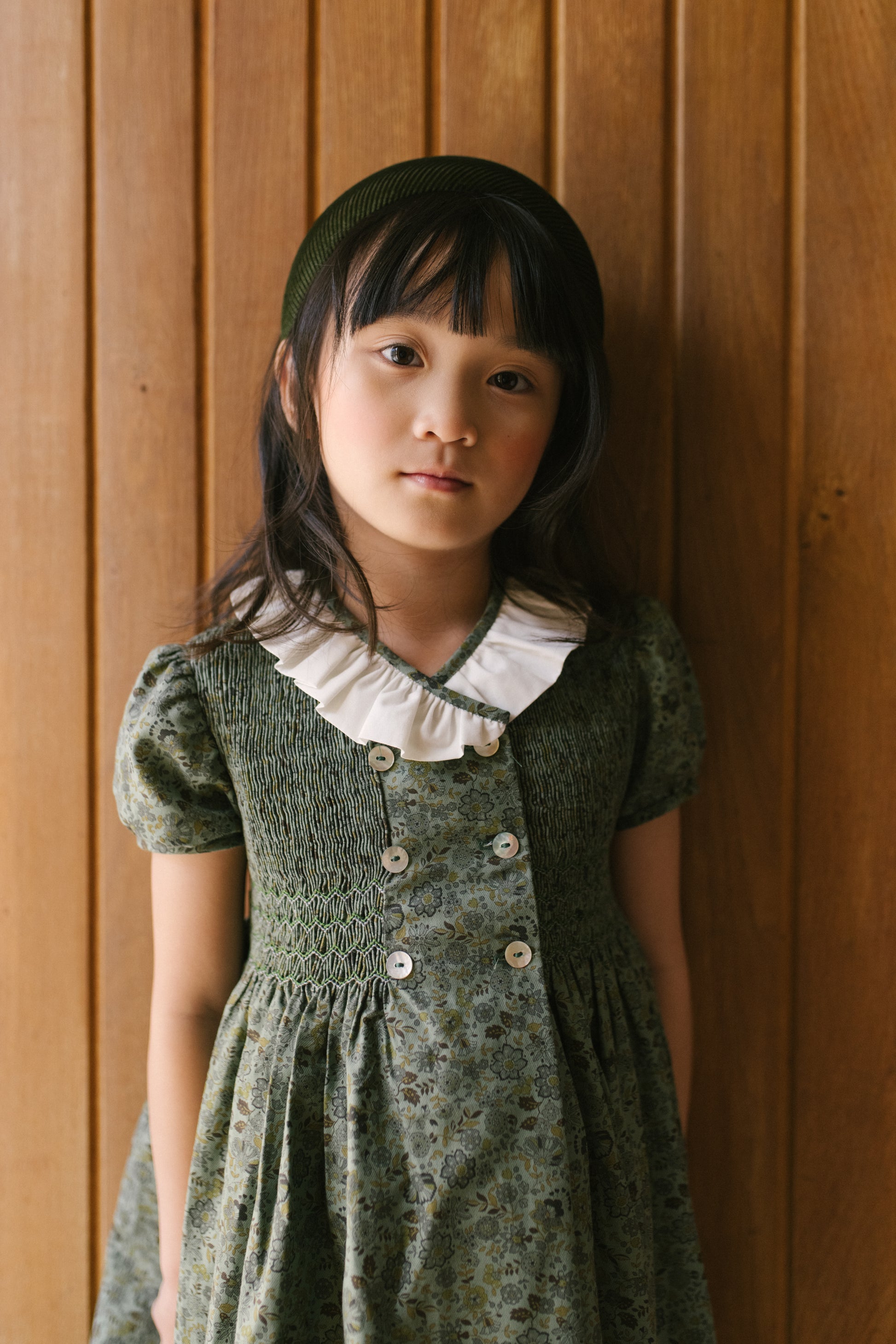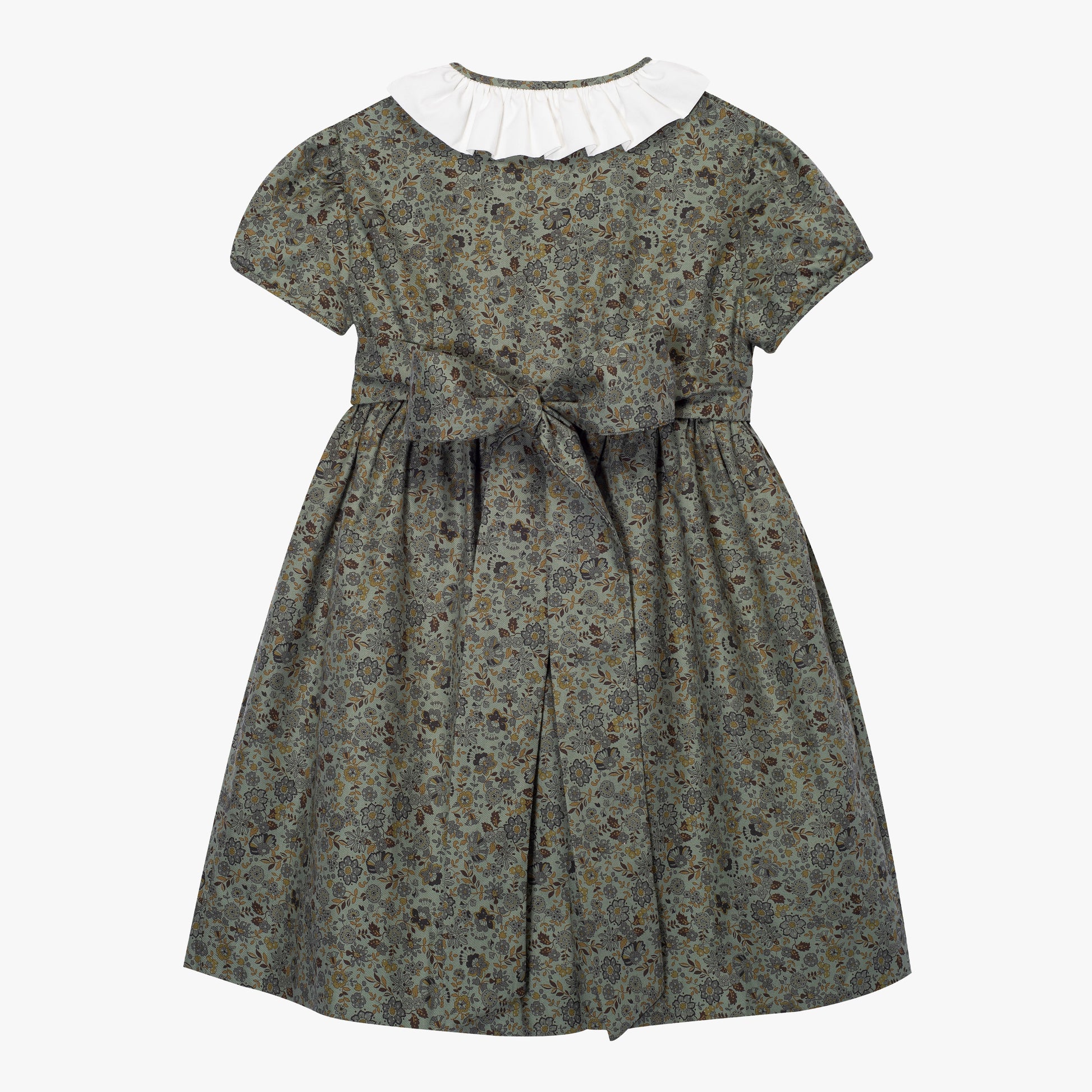 Odkryj stonowaną elegancję z naszą elegancką sukienką dla dziewczynki w kwiatowe wzory, utrzymaną w delikatnych odcieniach oliwkowej zieleni i subtelnych motywów kwiatowych. Sukienka wyróżnia się klasycznym kołnierzykiem wykonanym z białej koronki, ręcznie wykonanymi marszczeniami oraz subtelnymi detalami, które nadają jej wyjątkowego charakteru. To idealna sukienka na święta dla dziewczynki, doskonała również jako sukienka na wigilię czy sukienka na Boże Narodzenie.